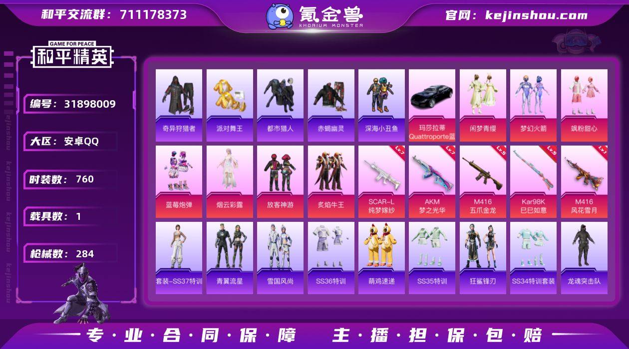本人一手连体号 王者 金铲铲 火影 三角洲都有皮肤急出 热力值:10086,7粉装,5粉枪,1载具,23粉色战备,196套装,273枪械,375装备,14滑翔尾翼,89降落伞;等级:Lv.70 历史最高段位:超级王牌12星 当前段位:超级.王牌3星;王牌印记16次 卓越印记1次;地铁满天赋; 【热门套装】:套装-赤蝎幽灵,套装-都市猎人,套装-浪漫天命,套装-金羽特工,套装-派对舞王,套装-奇异狩猎者,套装-暗影哥特,套装-深海小丑鱼,套装-小丑鱼,套装-粉红小猪,角色-军刀雅典娜,套装-龟仙人;【粉色套装】:粉装-梦幻火箭,粉装-放客神游,粉装-蓝莓炮弹,粉装-炙焰牛王,粉装-飒粉甜心,粉装-闲梦青缨,角色-烟云彩露;【粉色枪械】:M416-风花雪月[4级],M416-五爪金龙[6级],SCAR-L-纯梦嫁纱[7级],AKM-梦之光华[7级],Kar98K-巳巳如意[5级];【粉色载具】:玛莎拉蒂Quattroporte(夜幕蓝);【粉色滑翔尾翼】:炫彩糖果飞行器,鎏金朋克飞行器,星夜魔法师飞行翼,齐天大圣飞行器,祥瑞锦鲤飞行器等