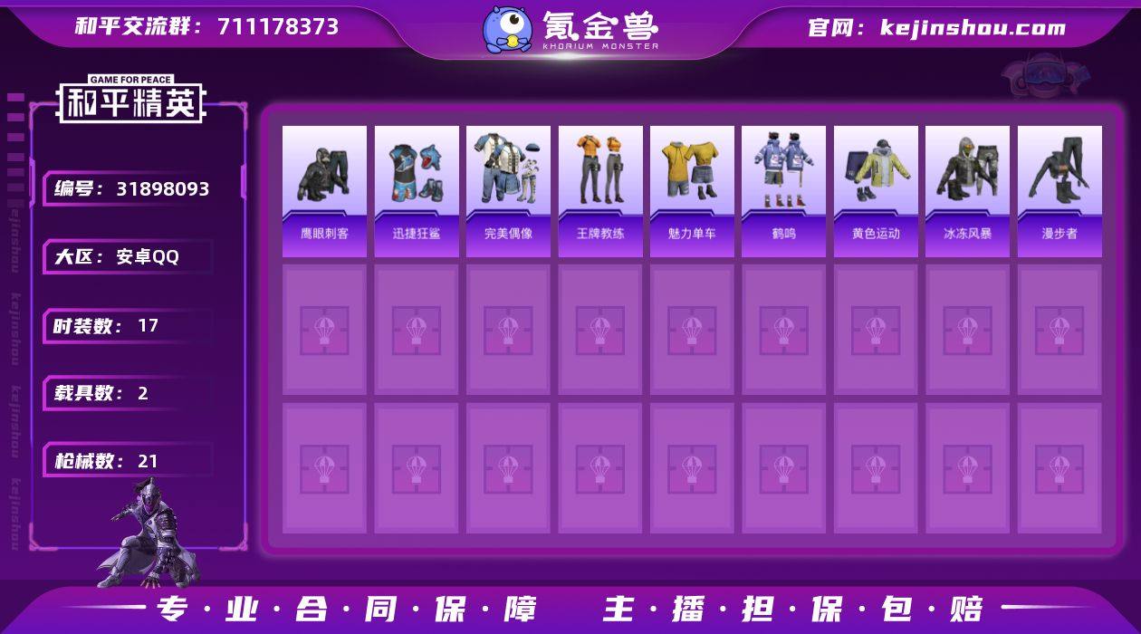 【ky389】安卓 手Q-1粉装-7特效枪-1载具-1粉色飞行器-37089热力值-2王牌印记-103套装-125枪皮 【热门品类】:套装-金羽特工,套装-忍者信条 【粉色套装】:粉装-精灵迷巫 【粉色枪皮等级】:M416-五爪金龙(五级),AKS-74U-森灵之息(五级),Kar98K-巳巳如意(五级),DP-28-豹影疾电(五级) 【粉色载具】:玛莎拉蒂Ghibli(蓝) 【粉色枪皮】:M416-五爪金龙,ACE32-萌骑漫游,UMP45-萌骑冒险,AKS-74U-森灵之息,Kar98K-巳巳如意,Mk14-福马献瑞,DP-28-豹影疾电 【粉色飞行器】:春暖花开飞行器 【粉色降落伞】:幻影战神降落伞,春暖花开降落伞,罪夜之冕降落伞 【稀有套装】:套装-巳巳如意,套装-马上来财,套装-雨过天青,套装-红釉青花 【稀有枪皮】:AKM-春暖花开,AKM-生命誓言,AKM-霓虹街区,M16A4-红色方程式,SCAR-L-夜灯,SCAR-L-炫彩节奏,SCAR-L-生命誓言,SCAR-L-雷霆特警,M416-魔法学院,GROZA-春暖花开,GROZA-生命誓言,GROZA-雷霆特警,GROZA-黑色刀锋,AUG-幻影战神,AUG-拳皇97,QBZ-诡娃娃,M762-天降萌叽,M762-拳皇97,M762-牛气冲天,M762-生命誓言,M762-诡娃娃,Mk47-百万伏特,Mk47-粉色回忆,UZI-天降萌叽,UZI-幻影战神,UZI-魔法学院,UMP45-夜灯,UMP45-春暖花开,UMP45-诡娃娃,Vector-彩虹符号,Vector-黑色刀锋,汤姆逊-天降萌叽,汤姆逊-幻影战神,汤姆逊-耀粉歌者,Kar98K-幻影战神,Kar98K-彩虹符号,Kar98K-王子的夏天,M24-影袭,M24-炫彩节奏,M24-冰封烈焰,SKS-夜灯,SKS-玉龙,SKS-诡娃娃,VSS-华贵君王,VSS-雷霆特警,VSS-黑色刀锋,Mini14-春暖花开,Mini14-炫彩节奏,Mini14-生命誓言,Mini14-耀粉歌者,SVD-冷漠罗丽,S686-冰封烈焰,S686-生命誓言,S1897-春暖花开,S12K-幻影战神,M249-拳皇97,DP-28-彩虹符号,MG3-幻世战舞者,MG3-第五大道,P92-拳皇97,P9...