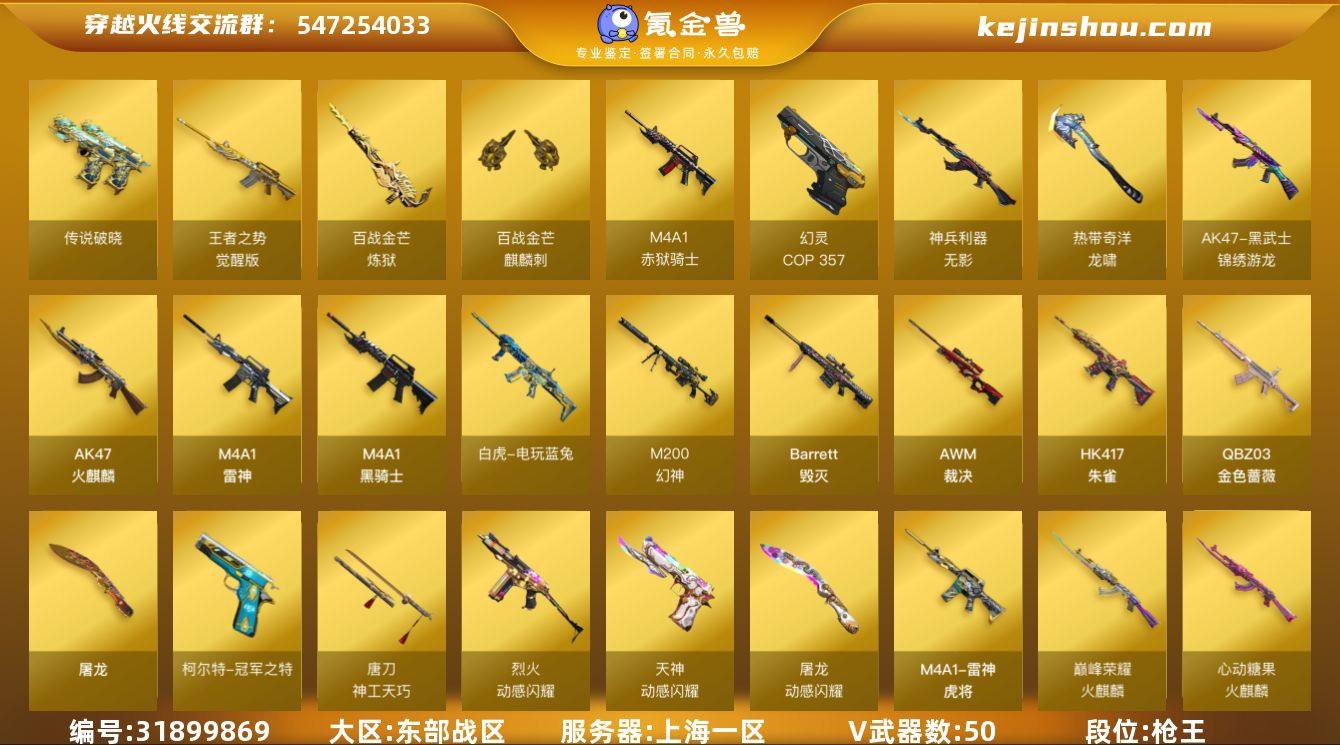 【ky6048】上海一区-51V-6王者武器数-0炫金武器数 【传说武器】:传说破晓 【热门武器】:传说破晓,QBZ03-金色蔷薇,HK417-朱雀,M200-幻神,白虎-电玩蓝兔*2,柯尔特-冠军之特*2,M4A1-黑骑士,COP 357-幻灵 【音效卡】:沙鹰-修罗-盛典舞曲音效卡*2,麒麟刺-百战金芒-盛典舞曲音效卡,炼狱-百战金芒-庆典舞曲音效卡 【皮肤】:幻神-宠儿-2021MVP,幻神-纸灯龙皮肤,幻神-电流骇客 皮肤,QBZ03-AG-CFPLS19冠军,QBZ03-巅峰荣耀皮肤,裁决-巅峰荣耀 皮肤,雷神-荣耀之魄,雷神-虎将,雷神-源计划2.0专属 皮肤,M4A1-再燃火线,火麒麟-百城,火麒麟-巅峰荣耀,火麒麟-心动糖果,毁灭-直播专属,毁灭-英雄计划 皮肤,轻型军用手斧-再燃火线,麒麟刺-甜蜜糖果 皮肤 【角色】:王者-魅影,王者潘多拉,奇洋探员,乔伊教练,葵-阿尔法武装,暗夜-X,飞虎队-X,风暴女,虎妞,嘉年华灵狐,灵狐者-X,麻雀,女主播,潘多拉-X,斯沃特-X,雪莉杨-摸金校尉,幽,游珑儿 【人偶武器】:AWM-灵狐-15周年嘉年华,生化手雷-机甲核心 【暴走生化】:超级对讲机 【挑战大师】:神圣爆裂者-末日III 【英雄级武器】:AK47-火麒麟,M4A1-雷神*2,M4A1-黑骑士,HK417-朱雀,无影-神兵利器,黑武士-锦绣游龙,QBZ03-金色蔷薇,烈火-动感闪耀,王者之势-觉醒版,白虎-电玩蓝兔*2,Barrett-毁灭,AWM-裁决,M200-幻神,炼狱-百战金芒,COP 357-幻灵,柯尔特-冠军之特*2,天神-动感闪耀,屠龙,唐刀-神工天巧,屠龙-动感闪耀,龙啸-热带奇洋,麒麟刺-百战金芒,丛林匕首-玄豹*2,高爆手雷-幻灵,高爆手雷-神工天巧,手雷-动感闪耀,高爆手雷-云龙*2,手雷-热带奇洋,高爆手雷-玄豹,高爆手雷-雷霆王者-觉醒版,闪光弹-幻灵,闪光弹-神工天巧,闪光弹-云龙*2,闪光弹-玄豹,闪光弹-雷霆王者-觉醒版*2,烟雾弹-神工天巧*2,烟雾弹-云龙*4,...