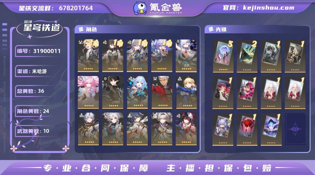 总黄数:36 五星光锥数:10 五星角色数:24 开拓等级:70 开拓者性别:女 星轨专票:0 梦华数量:28 星琼数量:1138 2命彦卿,1命阮·梅,1命布洛妮娅,1命白露,0命爻光,0命昔涟,0命丹恒·腾荒,0命刻律德菈,0命Archer,0命Saber,0命白厄,0命飞霄,0命云璃,0命流萤,0命花火,0命真理医生,0命符玄,0命丹恒·饮月,0命刃,0命罗刹,0命银狼,0命景元,0命瓦尔特,0命克拉拉 3精记忆永不落幕,2精星海巡航,1精比阳光更明亮的,1精拂晓之前,1精银河铁道之夜,1精以世界之名,1精无可取代的东西,1精时节不居,1精记忆的质料,1精记一位星神的陨落 换绑材料:可提供换绑材料 邮箱状态:未绑定 psn绑定情况:否 taptap绑定情况:否 卖家说:任务活动多可玩性高开服至今只歪过一次提前金概率高
