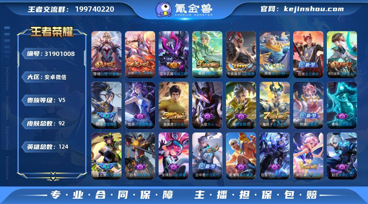实名: 可修改 性别: 男号 贵族等级: V5 英雄数: 124 皮肤数: 92 传说皮: 久胜战神,地狱之眼,山海·炽霜斩,乘龙·淬吴钩 限定皮: 李小龙,傲雪梅枪,五谷丰年,山海·玄木吟,鸣野蒿 亮点: 【优质装备】:久胜战神,地狱之眼,山海·炽霜斩(李信年限)