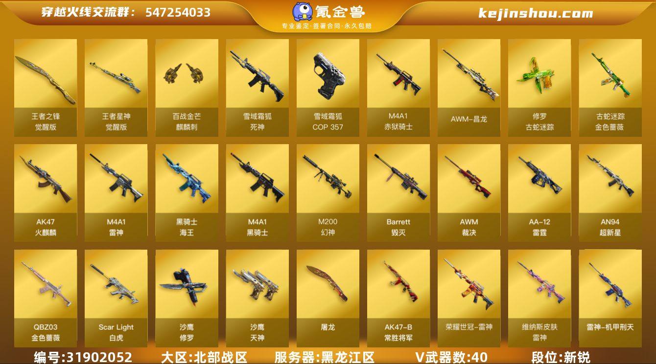 【穿越火线CF-2522】南方大区-135V-19王者-7炫金 【热门武器】:QBZ03-金色蔷薇,HK417-朱雀,M200-幻神,M4A1-黑骑士,汤姆逊-烈龙*4,RPK-盘龙,加特林-炼狱*4,火麒麟-绝迹,USP-雷暴,COP-堕天神,沙鹰-修罗*5 【王者炫金武器】:炫金火麒麟,炫金无影,炫金天龙,炫金天神,炫金黑龙,炫金雷神,炫金武士,王者之幻,王者之势,王者之武,王者之光,王者之怒,王者之力,王者之魄,王者之锋 【音效卡】:Scar Light-白虎-热带奇洋音效卡,AK47-火麒麟音效卡,M4A1-雷神音效卡,Barrett-毁灭音效卡 【稀有皮肤】:雷神-能量核心,雷神-荣耀之魄,火麒麟-冠军之心,黑骑士-暗月*3,毁灭-暗月,毁灭-荣耀之怒,毁灭耀金皮肤,毁灭-冠军之怒,天龙-秘银,天龙-能量核心,无影耀金皮肤,天神-暗月*2 【角色】:王者-瞳-闭月羞花,王者-葵-貂蝉,王者-零,雅典娜,零-水下丽影,零,葵,炫,春,战地猎狐,蜀雪,铁骑荣耀,青霞仙子 【人偶武器】:火麒麟-绝迹,COP-旗袍,夺魂,迷你牛牛,生化手雷-机甲核心,闪光弹-貂蝉,高爆手雷-大乔 【挑战大师】:神圣爆裂者III,神圣爆裂者-末日III,阐释者III,冰龙粉碎者-白马银枪 【英雄级武器】:马来剑-夜魔,COP-堕天神,AK47-雷暴,USP-雷暴,斩神刀-雷暴,M4A1-雷霆,M4A1-武圣,QBZ03-金色蔷薇,HK417-朱雀,M4A1-雷神*3,M4A1-黑龙,M4A1-黑骑士,M4A1-死神,RPK-盘龙,加特林-炼狱*4,汤姆逊-烈龙*4,AK47-无影*3,AK47-火麒麟*3,AK47-黑武士,AK12-天启*2,AN94-超新星*3,AWM-天龙*3,Barrett-毁灭*5,Barrett-极光*2,M4A1-龙血*3,AK47-机械迷城*2,AA-12-雷霆,M200-幻神,AK47-黑鲨,M4A1-千变,黑武士-锦绣游龙,超新星-热带奇洋,AK47-B-常胜将军,沙鹰-天神*5,沙鹰-修罗*5,麒麟刺*3,擎天*3,龙啸*3,屠龙*6,龙啸-热带奇洋 【特殊枪械】:1黑骑士...