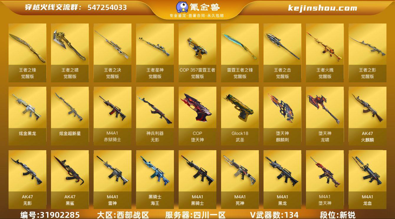 四川一区-153V-21王者武器数-3炫金武器数 【热门武器】:QBZ03-金色蔷薇*3,Scar Light-白虎,HK417-朱雀,M4A1-青龙,M200-幻神,M200-竞技荣光,C.A.T,M4A1-黑骑士*2,汤姆逊-烈龙*6,RPK-盘龙*3,加特林-炼狱*3,斯泰尔-蝴蝶,裁决-雪莉杨,USP-雷暴,COP-堕天神,沙鹰-修罗*3,金刚伞 【王者炫金武器】:炫金黑龙*2,炫金超新星 【音效卡】:M200-幻神音效卡,AK47-火麒麟音效卡,M4A1-黑骑士音效卡,Barrett-毁灭音效卡,Barrett-极光音效卡,QBZ03-金色蔷薇音效卡,Barrett-碧霄极光音效卡 【皮肤】:幻神-丹凤,裁决-叶芒苍灵 皮肤,雷神-荣耀之魄,雷神-星空,雷神-虎将,雷神-宠儿-2019MVP,雷神-烈虎皮肤,火麒麟-轻羽皮肤,火麒麟-战神关羽,毁灭-荣耀之怒,毁灭耀金皮肤,毁灭-BEAN-2020MVP,毁灭-黑大圣皮肤,毁灭-魔灵皮肤,毁灭-英雄计划 皮肤,M4A1-千变-孔明皮肤,黑骑士耀金皮肤,死神-秘银,天启-暗月,战神-粉色甜心皮肤,战神-紫绶金章皮肤,战神-流金岁月皮肤,AK47-B-常胜将军-曹操*2,AK47-B-常胜将军-刘备,AK47-B-常胜将军-孙权,极光-能量核心,修罗-能量核心,修罗-冠军之魂,屠龙-荣耀之锋*2 【角色】:葵,樱,魅影,电竞教官-云悠悠,审判者,战地猎狐,王者樱-热浪之夏,王者玲珑-小乔,乔伊教练,修道士,风暴女,虎妞,嘉年华灵狐,娟娟,灵动武士,灵狐者-黄金海岸,灵狐者-职业经理,龙儿,女战神,邱刚敖,莎莎,蜀雪,铁骑荣耀,职业选手 【人偶武器】:裁决-雪莉杨,天龙-曼陀罗,火麒麟-灵狐,斯泰尔-蝴蝶,巴雷特-零-水下丽影,AWM-灵狐-15周年嘉年华*2,M37-葵,COP-旗袍,C.A.T,迷你牛魔王,闪光弹-小乔,闪光弹-貂蝉,高爆手雷-大乔,迷你艾比,迷你巨石泰坦-魔花研究所,灵狐娃娃手雷 【暴走生化】:黑龙吞噬者 【挑战大师】:神圣爆裂者III,AK47-冰龙粉碎者,激...