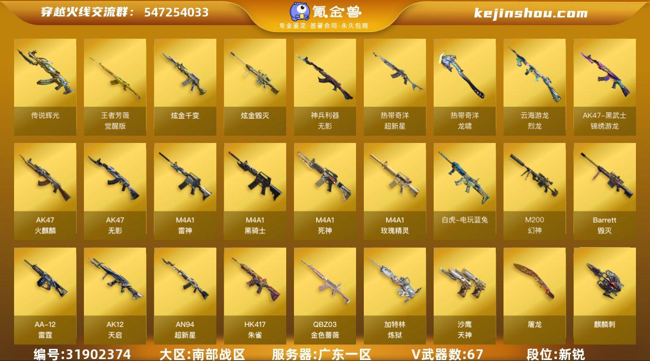 广东一区-67V-1王者武器数-2炫金武器数 【传说武器】:传说辉光 【热门武器】:传说辉光,QBZ03-金色蔷薇,M14EBR-玄武,HK417-朱雀,M200-幻神,M200-竞技荣光,白虎-电玩蓝兔,柯尔特-冠军之特,Cat-刀锋,M4A1-黑骑士,加特林-炼狱,斯泰尔-蝴蝶,火麒麟-绝迹,USP-雷暴,Knife-冠军之刃,黄金猫猫手套-白鲨 【王者炫金武器】:炫金千变,炫金毁灭 【音效卡】:M4A1-雷神音效卡,M4A1-黑骑士音效卡,Barrett-毁灭音效卡,QBZ03-金色蔷薇音效卡,70KG语音包 【皮肤】:M200-幻神-黄忠皮肤,幻神-宠儿-2021MVP,QBZ03-冠军之薇,雷神-星空,雷神-冠军之魄,M4A1-战神赵云,雷神-宇航兔皮肤,雷神-云海游龙皮肤,雷神-源计划2.0专属 皮肤,火麒麟-雷神,火麒麟-冠军之心,火麒麟-百城,火麒麟-心动糖果,毁灭-暗月,毁灭-冠军之怒,毁灭-黑大圣皮肤,毁灭-风暴,黑龙-能量核心,黑骑士-冠军之势,黑武士-典韦皮肤,战神-紫绶金章皮肤,战神-流金岁月皮肤,AK47-B-常胜将军-曹操,炼狱-玩具枪皮肤,麒麟刺-萌杀皮肤 【角色】:电竞教官-云悠悠,晴雅,王者樱-热浪之夏,王者-零-国色天香,堕落女神,奇洋探员,乔伊教练,云海玲珑,初恋灵狐,电竞少女,芳心审判者,飞虎队-X,风暴女,虎妞,嘉年华灵狐,娟娟,0号玩家,零-水下丽影,灵狐-花神,龙儿-小淘气,曼陀罗-礼服,萌儿,潘多拉-X,潘多拉-甜心教官,青霞仙子,斯沃特-X,兔囡囡,维纳斯,夜玫瑰-宠粉,樱-战斗天使,游珑儿,职业选手 【人偶武器】:火麒麟-绝迹,天龙-曼陀罗,火麒麟-灵狐,天龙-乔伊教练,斯泰尔-蝴蝶,AWM-灵狐-15周年嘉年华,海滩汪汪-巴雷特,Cat-刀锋,迷你牛牛,生化手雷-机甲核心*2,深渊终结者手雷,迷你超能女侍 【暴走生化】:超级对讲机 【挑战大师】:冰龙粉碎者-白马银枪,激光毁灭者III-白马银枪*2,神圣爆裂者-末日III...