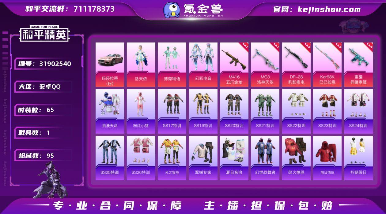 安卓 【小号 浪漫天命/洛天依/M416-五爪金龙(七级)/玛莎拉蒂Ghibli(粉)】手Q-3粉装-5特效枪-1载具-3粉色飞行器-30878热力值-5王牌印记-65套装-95枪皮 【热门品类】:套装-浪漫天命,套装-粉红小猪 【粉色套装】:角色-洛天依,粉装-薄荷物语,粉装-幻彩电音 【粉色枪皮等级】:M416-五爪金龙(七级),蜜獾-异瞳寒姬(四级),Kar98K-巳巳如意(五级),DP-28-豹影疾电(五级),MG3-洛神天依(七级) 【粉色载具】:玛莎拉蒂Ghibli(粉) 【粉色枪皮】:M416-五爪金龙,蜜獾-异瞳寒姬,Kar98K-巳巳如意,DP-28-豹影疾电,MG3-洛神天依 【粉色飞行器】:炫彩糖果飞行器,歌者泠鸢飞行器,极意拳锋飞行器 【粉色降落伞】:洛神天依降落伞,环太平洋降落伞,彩虹甜喵降落伞,炫彩糖果降落伞 【稀有套装】:套装-炫彩糖果 【稀有枪皮】:AUG-冰晶雪宝,AKM-奇异狩猎者,AKM-虎虎生威,AKM-龙的传人,M16A4-幻世战舞者,M16A4-甜心亚梦,SCAR-L-夜灯,SCAR-L-炫彩节奏,SCAR-L-玉兔迎春,M416-糯团青竹,M416-绿野极光,GROZA-田园牧歌,AUG-耀粉歌者,QBZ-彩虹符号,QBZ-洛神天依,QBZ-神秘黑猫,QBZ-银碳小老虎,QBZ-飞驰魅影,M762-天降萌叽,Mk47-洛神天依,AC-VAL-天降萌叽,AC-VAL-甜心亚梦,蜜獾-天降萌叽,蜜獾-娇憨猪猪,UZI-娇憨猪猪,UMP45-夜灯,Vector-生命誓言,Vector-田园牧歌,汤姆逊-天降萌叽,P90-飞驰魅影,P90-巳巳如意,Kar98K-洛神天依,Kar98K-炫彩节奏,Kar98K-飞驰魅影,M24-奇异狩猎者,VSS-田园牧歌,Mini14-旋转彩虹,Mk14-猪猪侠,SLR-娇憨猪猪,S1897-炫彩节奏,S1897-飞驰魅影,S12K-破晓战魂,S12K-香水柠檬,S12K-夜灯,S12K-娇憨猪猪,S12K-幻世战舞者,S12K-极意拳锋,DBS-甜心亚梦,SPAS-12-田园牧歌,M249-彩虹符号,M249-百万伏特,M249-糯团青竹,DP-28-彩虹符号,DP-28-旋转彩虹,DP...