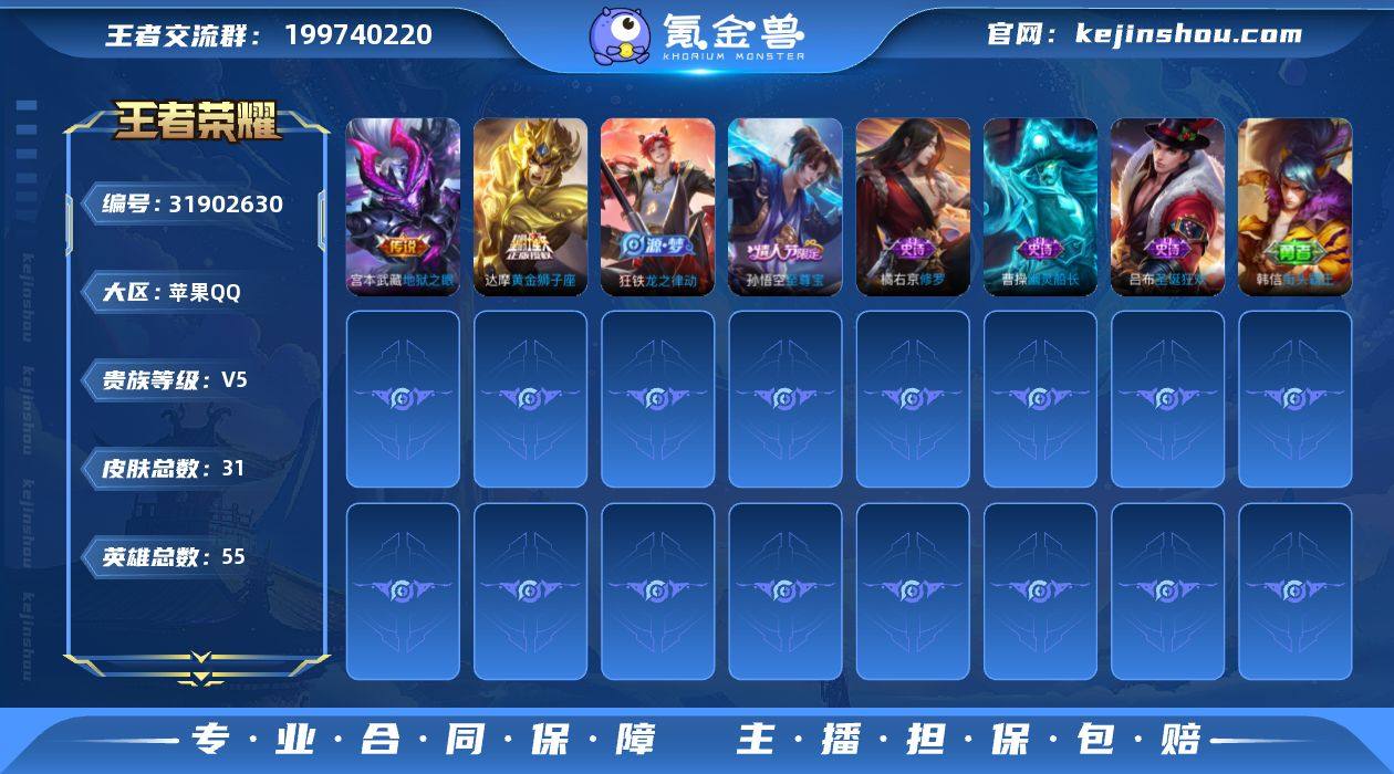 1w杨戬·金标准万战猴子·无相·天机无算天幕·永曜之星·死亡执政官·纵目迁山·千山共赴·至尊宝·可二次】w17371-苹果Q-55英雄-31皮肤-3王者印记-60铭文-贵族积分0w【贵族5】【1无双·1星传说·6传说·1天幕·4按键】【因赛季更新游戏段付以上号为准!】 【无双皮肤】:孙悟空无相 【天幕】:天机无算天幕 【传说皮肤】:杨戬纵目迁山,干将莫邪千山共赴,大司命死亡执政官,达摩黄金狮子座,杨戬永曜之星,宫本武藏地狱之眼 【限定皮肤】:赵云皇家上将,项羽海滩派对,孙悟空至尊宝,杨戬永曜之星 【年限皮肤】:杨戬永曜之星 【赛季限定】:甄姬逆浪荇歌,亚瑟荣光之誓 【战令限定】:周瑜线条小狗 【史诗皮肤】:周瑜线条小狗,女娲万灵启世,狂铁龙之律动,橘右京修罗,孙悟空至尊宝,曹操幽灵船长,吕布圣诞狂欢,赵云皇家上将 【其他皮肤】:鲁班七号班班快跑,虞姬溯影追猎,蚩奼极光幻客,艾琳鹤鸣心笺,亚瑟荣光之誓,鬼谷子克喵,甄姬逆浪荇歌,莱西奥西部游侠,戈娅危途狂花,后羿阿尔法小队,牛魔西部大镖客,韩信街头霸王,项羽海滩派对,李信灼热之刃,元歌午夜歌剧院,花木兰剑舞者