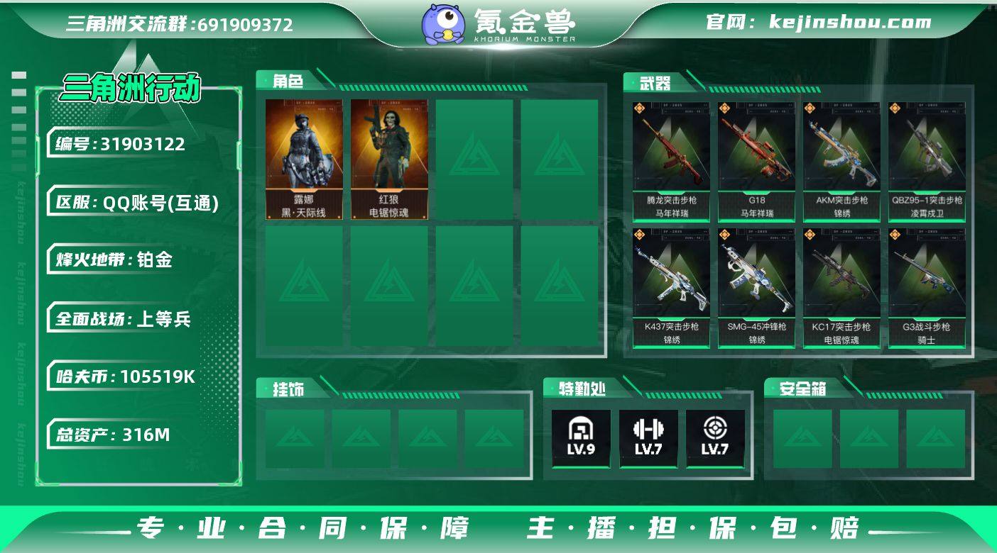 【SJZ4373】总资产(M):316M/哈夫币(K):105519K/哈夫币(K):105519K/传说枪皮数:26/全面战场等级:41_段位:上等兵/烽火地带等级:60_段位:铂金/露娜-黑·天际线/红狼-电锯惊魂/近战-黑鹰/M4A1突击步枪-阿米娅/AKM突击步枪-锦绣/QBZ95-1突击步枪-凌霄戍卫/ASh-12战斗步枪-鹅鸭杀/M16A4突击步枪-狩猎时刻/SCAR-H战斗步枪-启航/SCAR-H战斗步枪-荼蘼/G3战斗步枪-狩猎时刻/G3战斗步枪-骑士/CAR-15突击步枪-阿米娅/腾龙突击步枪-捞点薯条/腾龙突击步枪-马年祥瑞/K437突击步枪-锦绣/KC17突击步枪-电锯惊魂/Vector冲锋枪-狩猎时刻/SMG-45冲锋枪-锦绣/SR-3M紧凑突击步枪-荼蘼/勇士冲锋枪-能天使-午夜邮差/QCQ171冲锋枪-鹅鸭杀/PKM通用机枪-荼蘼/QJB201轻机枪-鹅鸭杀/SR-25射手步枪-水墨云图/AWM狙击步枪-捞点薯条/G18-马年祥瑞/93R-捞点薯条/复合弓-黑-天际线/AKM突击步枪-林中猎手/QBZ95-1突击步枪-曙光/K416突击步枪-阿萨拉特攻/M16A4突击步枪-竞赛选手/AUG突击步枪-蝮蛇/SG552突击步枪-深海恐惧/SG552突击步枪-哈夫克警备/SCAR-H战斗步枪-囚徒/G3战斗步枪-哈夫克警备/腾龙突击步枪-猎鳄行动/MP5冲锋枪-深海恐惧/MP5冲锋枪-战术竞备/MP5冲锋枪-竞技风/P90冲锋枪-莫斯提马/Vector冲锋枪-阿萨拉文明/Vector冲锋枪-猎鳄行动/SR-3M紧凑突击步枪-战术竞备/勇士冲锋枪-工业狂潮/MP7冲锋枪-六套之力/M1014霰弹枪-林中猎手/S12K霰弹枪-曙光/PKM通用机枪-蝮蛇/PKM通用机枪-阿萨拉特攻/M250通用机枪-囚徒/SVD狙击步枪-阿萨拉工艺/M14射手步枪-工业狂潮/SV-98狙击步枪-林中猎手/SV-98狙击步枪-囚徒/R93狙击步枪-竞赛选手/M700狙击步枪-哈夫克警备/M700狙击步枪-旧梦/SCAR-H战斗步枪-旧梦/AUG突击步枪-千里骏骨/野牛冲锋枪-千里骏骨/QJB201轻机枪-千里骏骨/AKM突击步枪-肃杀/QBZ95-1突击步枪-公平竞技/K416突击步枪-一帆风顺/M16A4...