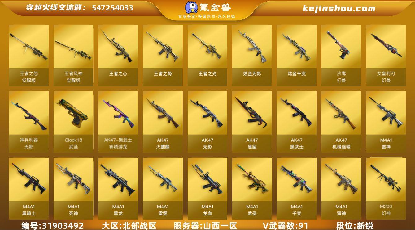 山西一区-97V-5王者武器数-6炫金武器数 【热门武器】:M200-幻神,死亡之眼,C.A.T,M4A1-黑骑士,汤姆逊-烈龙*7,加特林-炼狱*2,沙鹰-修罗*4,炽芒蝶刃,高爆手雷-幻兽 【王者炫金武器】:王者之势,王者之心,王者之光,炫金无影,炫金千变*5 【音效卡】:Barrett-极光音效卡 【皮肤】:幻神-丹凤,雷神-暗月,雷神-星空,M4A1-雷神-新春神龙皮肤,火麒麟-心动糖果,毁灭-暗月*3,毁灭-冠军之怒,黑骑士-暗月*2,无影-暗月,无影-能量核心*2,死神-秘银,天启-暗月*3,天龙-能量核心,极光-能量核心,修罗-能量核心*4,天神-暗月 【角色】:零,葵,炫,审判者,王者凌霄,狐影,云海玲珑,初恋灵狐,电竞少女,飞虎队-X,风暴女,猎狐者-追月,灵狐-花神,灵狐者-黄金海岸,灵狐者-七夕宝贝,曼陀罗-礼服,女主播,潘多拉-甜心教官,斯沃特-X,铁骑荣耀,影武者-X,游珑儿 【人偶武器】:M37-葵,COP-旗袍,C.A.T,迷你生化手雷 【暴走生化】:死亡之眼,超级对讲机 【英雄级武器】:M4A1-千变,AK47-火麒麟*2,M4A1-黑龙,M4A1-雷神*2,M4A1-黑骑士,AK47-无影*2,M4A1-死神,AK47-黑武士,AK12-天启,M4A1-武圣,AK47-机械迷城,AK47-黑鲨,M4A1-龙血,M4A1-雷霆,无影-神兵利器,黑武士-锦绣游龙,M4A1-猎神*4,AK-47-猩红传说,AWM-天龙,Barrett-毁灭*3,M200-幻神,王者之怒-觉醒版,王者风神-觉醒版,加特林-炼狱*2,汤姆逊-烈龙*7,沙鹰-修罗*4,沙鹰-天神*6,COP-雷霆*2,沙鹰-幻兽,Glock18-武圣,屠龙*3,龙啸*4,擎天,麒麟刺,炽芒蝶刃,擎天-云海游龙,女皇利刃-幻兽,高爆手雷-雷霆*5,高爆手雷-幻兽,高爆手雷-竞技荣光,手雷-云海游龙,闪光弹-雷霆*5,闪光弹-幻兽,闪光弹-竞技荣光*2,烟雾弹-雷霆*5,烟雾弹-幻兽,烟雾弹-竞技荣光*2 【道具】:战舰背包,次元之矛-黄金背包,炫彩背包,老...