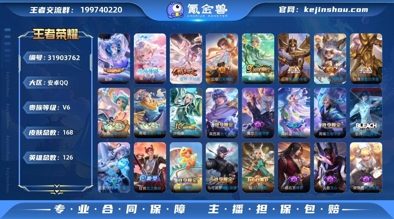 贵族等级:V6 典藏皮肤数:1 珍品无双皮肤数:0 无双皮肤数:0 珍品传说皮肤数:1 传说皮肤数:6 史诗皮肤数:47 皮肤数:168 英雄数:126 段位:钻石