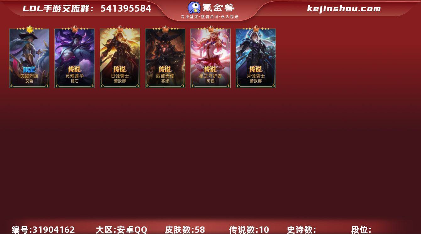 DSL513安卓Q-2神话-10传说-13史诗-57英雄-58皮肤 段位:钻石 【神话】 天陨烈辉艾希 至臻 星域秘刃泰隆 【传说】 星域游侠崔斯特 日蚀骑士蕾欧娜 灵魂莲华锤石 神龙尊者 驭风啸龙 神王德莱厄斯 西部天使赛娜 星之守护者阿狸 炼狱魔犬内瑟斯 月蚀骑士蕾欧娜 灌篮高手德莱厄斯