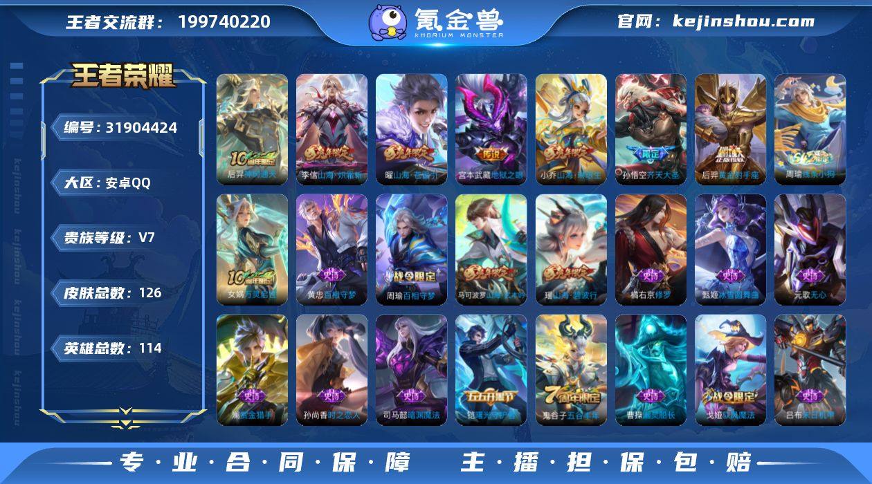 安卓Q-V1-尊贵铂金I段位-127英雄-227皮肤-7传说-59史诗【英雄全皮】:刘禅全皮,影全皮【传说皮肤】:女娲愿照千秋盛,虞姬愿照岁时盈,桑启鸣野蒿,曜山海苍雷引,李信山海炽霜斩,镜炽阳神光,后羿黄金射手座【限定皮肤】:姜子牙天穹之誓,狄仁杰阴阳师,赵云皇家上将,嬴政优雅恋人,孙尚香蔷薇恋人,高渐离死亡摇滚,元歌云间偶戏,元歌无心,马可波罗暗影游猎,狄仁杰魔术师,狄仁杰万华元夜,达摩星际陆战队,达摩沙漠行僧,项羽海滩派对,老夫子醍醐杖,程咬金演武夺筹,兰陵王金庭之子,亚瑟潮玩骑士王,钟馗驱傩正仪,女娲朔望之晖,雅典娜黎明之约,太乙真人华丽摇滚,鬼谷子原初探秘者,百里玄策原初追逐者,沈梦溪大漠名商,明世隐疑决卦,裴擒虎李小龙,裴擒虎擒涛扼浪,米莱狄胡桃异想国,云中君纤云弄巧,李信山海炽霜斩,上官婉儿梁祝,嫦娥暖冬兔眠,曜山海苍雷引,西施玲珑珍味,鲁班大师探海日志,桑启海盐诗旅,暃星界游侠,戈娅驭风魔法,艾琳流音漫舞,司空震地狱燃心,阿古朵江河有灵,张良古海寻踪,蒙恬荣光圣徽,鬼谷子天穹祈灯,姬小满妄想食味,沈梦溪龙舞盛年,鲁班七号蔬乡物语,李元芳蔬乡物语,刘邦剑破天穹,程咬金群星魔术团,周瑜熔金海岸【年限皮肤】:曜山海苍雷引,李信山海炽霜斩,女娲愿照千秋盛,虞姬愿照岁时盈【赛季限定】:明世隐疑决卦,老夫子醍醐杖,鬼谷子原初探秘者,狄仁杰万华元夜,程咬金演武夺筹,钟馗驱傩正仪,达摩沙漠行僧,兰陵王金庭之子,沈梦溪大漠名商,桑启海盐诗旅,裴擒虎擒涛扼浪,鲁班大师探海日志,张良古海寻踪,鬼谷子天穹祈灯,刘邦剑破天穹,姜子牙天穹之誓,东皇太一噬灭天穹,太乙真人谧流熔炉,钟馗虚灵犬护,甄姬逆浪荇歌,百里玄策原初追逐者,雅典娜黎明之约,蒙恬荣光圣徽,牛魔星界战将【战令限定】:女娲朔望之晖,马可波罗暗...