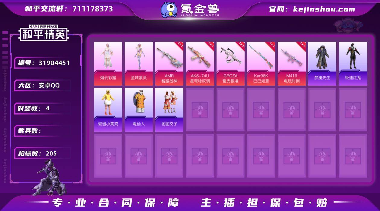 WJ604【4粉装6特效枪】安卓Q-4粉装6特效枪5热门165套装205枪皮 61837热力值 15印记 历史超级王牌15星 【4粉装】 绯穹魔姬 烟云彩露 金域紫灵 智耀战神 【6特效枪】 M416-电玩时刻 (5级) AKS-74U-星穹咏叹调 (7级) Kar98K-巳巳如意 (5级) DP-28-豹影疾电 (5级) AMR-智耀战神 (7级) GROZA-镜光银凌 (5级) 【5热门】 龟仙人 梦魇先生 团圆交子 破蛋小黄鸡 极速红龙 【1飞行器】 萌物绒绒飞行器 【1背包】 深海小丑鱼背包 营地ID:711948734