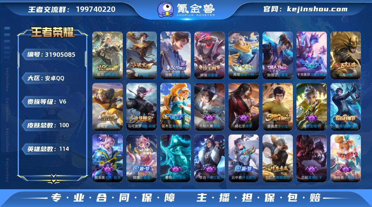 【精品号手慢无】100皮肤-3传说-27史诗 【传说皮肤】:后羿神树通天,孙策挚爱之约,曜李逍遥 【限定皮肤】:狄仁杰阴阳师,赵云皇家上将,马可波罗暗影游猎,狄仁杰魔术师,狄仁杰万华元夜,项羽海滩派对,老夫子醍醐杖,程咬金演武夺筹,花木兰青春决赛季,孙悟空至尊宝,孙悟空孙行者,李元芳银河之约,钟馗驱傩正仪,干将莫邪冰霜恋舞曲,鬼谷子原初探秘者,弈星混沌棋,沈梦溪星空之诺,明世隐疑决卦,裴擒虎李小龙,云中君纤云弄巧,孙策挚爱之约,猪八戒西部大镖客,嫦娥拒霜思,曜李逍遥 【赛季限定】:弈星混沌棋,明世隐疑决卦,老夫子醍醐杖,鬼谷子原初探秘者,狄仁杰万华元夜,程咬金演武夺筹,钟馗驱傩正仪,太乙真人谧流熔炉,钟馗虚灵犬护,亚瑟荣光之誓 【战令限定】:李元芳银河之约,沈梦溪星空之诺,马可波罗暗影游猎,猪八戒西部大镖客,周瑜线条小狗 【史诗皮肤】:钟馗锁墨魂,周瑜线条小狗,镜玫瑰异探,高渐离天秀音浪,澜赏金猎手,嫦娥拒霜思,孙悟空孙行者,云中君纤云弄巧,裴擒虎李小龙,马可波罗暗影游猎,马超神威,橘右京修罗,不知火舞魅语,李元芳银河之约,狄仁杰鹰眼统帅,干将莫邪冰霜恋舞曲,白起星夜王子,铠曙光守护者,花木兰青春决赛季,孙悟空至尊宝,李白千年之狐,曹操幽灵船长,妲己魅力维加斯,孙尚香水果甜心,廉颇地狱岩魂,狄仁杰魔术师,王昭君偶像歌手,赵云皇家上将