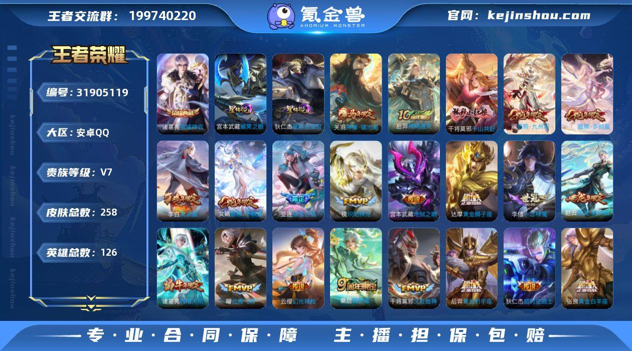 【精品号手慢无】258皮肤-1典藏皮肤-22传说-80史诗 【英雄全皮】:孙权全皮,敖隐全皮,空空儿全皮,影全皮。 【荣耀典藏】:诸葛亮星域神启 【传说皮肤】:关羽神骥镇沧海,后羿神树通天,干将莫邪千山共赴,女娲愿照千秋盛,澜愿照九州拓,虞姬愿照岁时盈,云缨幻光神枪,桑启鸣野蒿,亚连落雪白狼,赵云乘龙铭钟鼎,诸葛亮时雨天司,铠绛天战甲,镜炽阳神光,曜云鹰飞将,李信一念神魔,张良黄金白羊座,干将莫邪久胜战神,达摩黄金狮子座,后羿黄金射手座,李白凤求凰,宫本武藏地狱之眼,狄仁杰超时空战士 【限定皮肤】:蒙犽顽岩魄,姜子牙天穹之誓,杨戬破阵退雄兵,狄仁杰阴阳师,赵云皇家上将,赵云龙胆,阿轲迷踪丽影,吕布御风骁将,元歌云间偶戏,夏侯惇朔风刀,曹操天狼征服者,典韦岱宗,马可波罗暗影游猎,狄仁杰魔术师,狄仁杰万华元夜,项羽海滩派对,项羽霸王别姬,老夫子醍醐杖,程咬金演武夺筹,刘邦夺宝奇兵,亚瑟潮玩骑士王,孙悟空至尊宝,钟馗驱傩正仪,干将莫邪冰霜恋舞曲,雅典娜单词大作战,雅典娜黎明之约,蔡文姬繁星吟游,鬼谷子原初探秘者,诸葛亮时雨天司,百里玄策原初追逐者,弈星混沌棋,梦奇顽趣,明世隐疑决卦,裴擒虎李小龙,裴擒虎擒涛扼浪,米莱狄胡桃异想国,云中君纤云弄巧,猪八戒西部大镖客,上官婉儿神器万象笔,蒙犽狂想玩偶喵,鲁班大师探海日志,桑启海盐诗旅,艾琳女武神,阿古朵江河有灵,张良古海寻踪,蒙恬荣光圣徽,高渐离燃音魔法,妲己灵卜魔法,鬼谷子天穹祈灯,伽罗琥珀纪元,姬小满妄想食味,赵云乘龙铭钟鼎,亚连落雪白狼,沈梦溪龙舞盛年,鲁班七号蔬乡物语,李元芳蔬乡物语,刘邦剑破天穹,程咬金群星魔术团,周瑜熔金海岸 【年限皮肤】:李白凤求凰,典韦岱宗,诸葛亮时雨天司,吕布御风骁将,赵云乘龙铭钟鼎,女娲愿照千秋盛,澜愿照九州拓...