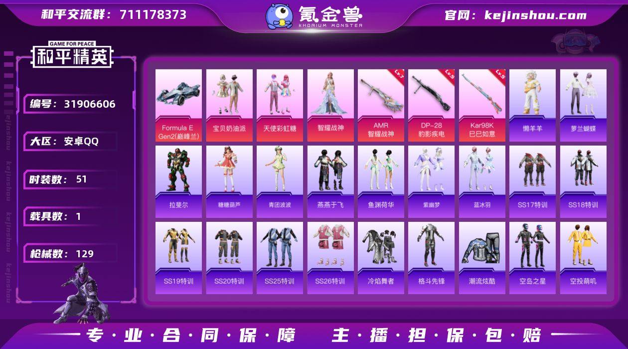 【10】安卓 手Q-3粉装-3特效枪-1载具-0粉色飞行器-33441热力值-1王牌印记-51套装-129枪皮 【粉色套装】:粉装-宝贝奶油派,粉装-天使彩虹糖,角色-智耀战神 【粉色枪皮等级】:Kar98K-巳巳如意(五级),AMR-智耀战神(七级),DP-28-豹影疾电(五级) 【粉色载具】:Formula E Gen2(巅峰兰) 【粉色枪皮】:Kar98K-巳巳如意,AMR-智耀战神,DP-28-豹影疾电 【粉色降落伞】:甜心宝贝降落伞,洛神天依降落伞,超新星降落伞,圣堂之誓降落伞,精灵梦叶罗丽降落伞,未来领航者降落伞,临安公主降落伞,星穹咏叹调降落伞 【稀有套装】:套装-萝兰蝴蝶,角色-拉斐尔,套装-糖糖葫芦,套装-青团波波,套装-燕燕于飞,套装-鱼渊荷华,套装-紫幽梦,套装-蓝冰羽,玩偶服-懒羊羊 【稀有枪皮】:AKM-彩虹符号,AKM-破晓战魂,AKM-萌趣颜团子,AKM-虎虎生威,AKM-龙的传人,M16A4-甜心亚梦,M16A4-红色方程式,M16A4-蓝色火焰,SCAR-L-玉兔迎春,SCAR-L-红色方程式,M416-红色方程式,M416-蓝色火焰,GROZA-异彩先驱,AUG-天降萌叽,AUG-耀粉歌者,QBZ-飞驰魅影,M762-瑞龙福将,M762-甜心宝贝,Mk47-妙红点点,Mk47-炫光之旅,AC-VAL-甜心亚梦,蜜獾-娇憨猪猪,UZI-啾咪啾咪,UZI-娇憨猪猪,UZI-红色方程式,UMP45-蓝色火焰,Vector-彩虹符号,汤姆逊-异彩先驱,汤姆逊-耀粉歌者,汤姆逊-智耀战神,MP5K-异彩先驱,P90-飞驰魅影,P90-巳巳如意,Kar98K-红色方程式,Kar98K-飞驰魅影,AWM-音爆索尼克,VSS-星之彼岸,Mini14-异彩先驱,Mini14-耀粉歌者,Win94-瑞龙福将,SLR-娇憨猪猪,AMR-妙红点点,M417-惊鸿侠骨,M200-惊鸿侠骨,M200-绿野极光,S686-红色方程式,S1897-飞驰魅影,S12K-瑞龙福将,S12K-破晓战魂,S12K-娇憨猪猪,DBS-彩虹符号,DBS-甜心亚梦,M249-妙红点点,M249-破晓战魂,DP-28-甜心亚梦,DP-28-甜心宝贝,...