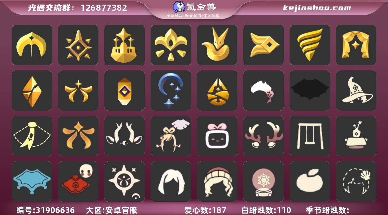 [17214986]iOS官服 手机账号 6珍稀物品 15毕业季 6毕业图 456蜡烛 【珍稀物品】白枭(帝企鹅发),阿努比斯(狗头),玫瑰花,透明蝶翼斗,彩虹围巾(五塑彩带斗),鳐鲲斗篷 【季节已毕业】圣岛季,预言季,梦想季,小王子季(王子季),风行季,潜海季,表演季,破晓季,欧若拉季(欧若拉),追忆季,夜行季,拾光季,归巢季,九色鹿(九色鹿季),筑巢季 【完成地图】晨岛,云野,雨林,霞谷,墓土(暮土),禁阁 【礼包】新年裤(瑞气服饰),爱心眼镜,水母(水母肩饰),绊爱(绊爱斗篷)(绊爱礼包),橘子(大橘大利),雪花(雪花发夹),贝壳(贝壳发饰),兔子(玉兔头饰)(玉兔发饰)(兔子发饰),四叶草(四叶草头饰),星月头饰(星月头冠),九色鹿角(神鹿祝福头饰)(神鹿祝福礼包),彩虹耳钉(彩虹耳饰),鹿角(圣诞鹿角),创始人(创始人斗篷),秋千(情人秋千),茶桌(花憩茶桌) 【裤子】筑巢季·裤子(设计师长袍),飞天裤(柔缎花边连)(九色鹿丝带裤),王子服(小王子套装),蓝绿裤(高领舞服),武士裤,背带裤,搓澡巾,击剑裤 【面具】黄眉企鹅面具,夜行毕业面具(棕熊面具),呼吸面具(潜水面具),贴花面具(丛林黑面具),阿努比斯,凤凰面具 【面饰】黑框眼镜(粗框眼镜),红耳机 【项链】围巾(肩带) 【发型】小王子发型,单侧绑发(单边小辫),留辫蘑菇头,飞天盘发(九色鹿丸子头),虚荣,归巢毕业发型(五塑彩羽发),若笠(箬笠) 【头饰】平顶帽,蓝色音乐会(蓝色音乐符),行军锅头盔(六边锅帽子)(双耳锅帽子),牛仔帽(西部帽),羽毛发饰(多羽发饰) 【斗篷】燕尾斗篷,冥龙斗篷,遥鲲斗篷(双翼遥鲲斗),粉红绒毛斗篷(绒毛斗篷),蟑螂斗(凤凰斗篷),绿芽,海洋斗 【配饰】鲲灯(追忆之书),蓝色手碟(毕业手碟),圆鼓(手拍大鼓),玫瑰花,相机(季卡相机),雨伞,筑巢季·小手办(光之子试衣),高音钢琴(白色高脚钢琴)