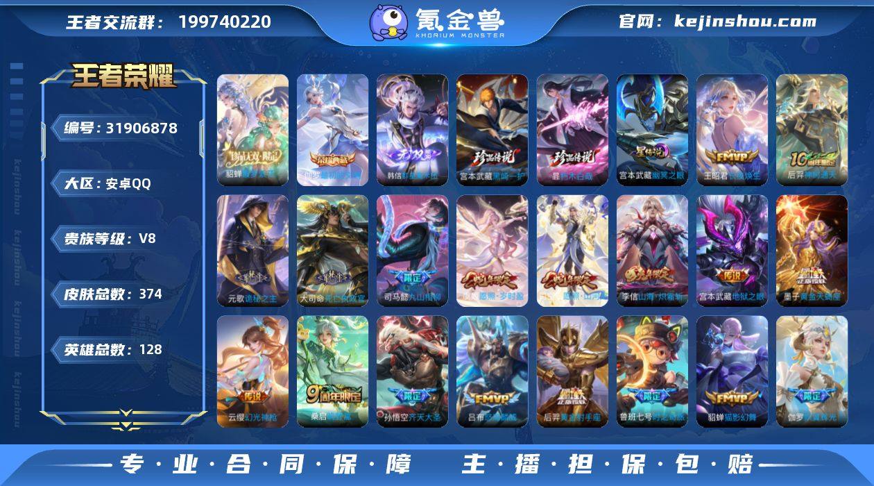安卓Q-无二次-V8(73274分)-374皮-1典藏-1珍品无双-1无双 -2珍品传说-21传说-10518场-21按键-【最新段位以实际为准,截图仅供参考】 【英雄全皮】:元歌全皮,孙权全皮,黄忠全皮,司空震全皮,戈娅全皮,空空儿全皮,影全皮 【荣耀典藏】:伽罗最初的交响 【珍品无双】:貂蝉馥梦繁花 【无双皮肤】:韩信群星魔术团 【珍品传说】:宫本武藏黑崎一护,暃朽木白哉 【传说皮肤】:王昭君长夜焕生,后羿神树通天,元歌诡秘之主,大司命死亡执政官,司马懿九山相柳,司空震愿照山河定,虞姬愿照岁时盈,云缨幻光神枪,桑启鸣野蒿,墨子黄金天蝎座,鲁班七号时之奇旅,花木兰燃星之曲,伽罗炽翼辉光,孙悟空齐天大圣,李信山海炽霜斩,吕布怒海麟威,后羿无尽星芒,虞姬启明星使,貂蝉猫影幻舞,后羿黄金射手座,宫本武藏地狱之眼 【限定皮肤】:蔡文姬夏日便利店,大乔绒语心约,虞姬夏日便利店,姜子牙天穹之誓,狄仁杰阴阳师,赵云皇家上将,赵云龙胆,赵云百木心枪,墨子神迹守卫,嬴政优雅恋人,嬴政白昼王子,孙尚香蔷薇恋人,鲁班七号时之奇旅,庄周高山流水,高渐离玩趣恶龙,钟无艳王者之锤,白起夜都怪侠,芈月重明,芈月幻夜卜梦,元歌云间偶戏,元歌无心,夏侯惇朔风刀,甄姬游园惊梦,典韦穷奇,典韦蓝屏警告,马可波罗山海玄木吟,狄仁杰魔术师,狄仁杰万华元夜,达摩星际陆战队,达摩沙漠行僧,项羽海滩派对,老夫子醍醐杖,老夫子航海奇遇记,程咬金演武夺筹,王昭君午后时光,兰陵王金庭之子,花木兰燃星之曲,亚瑟潮玩骑士王,孙悟空至尊宝,孙悟空孙行者,孙悟空齐天大圣,牛魔御旌,后羿圣弓游侠,后羿无尽星芒,张飞虎魄,李元芳云中旅人,虞姬启明星使,钟馗神迹守卫,钟馗驱傩正仪,干将莫邪真爱魔法,雅典娜单词大作战,雅典娜黎明之约,蔡文姬繁星吟游,鬼谷子原初探秘者,鬼谷子五谷丰年,黄...