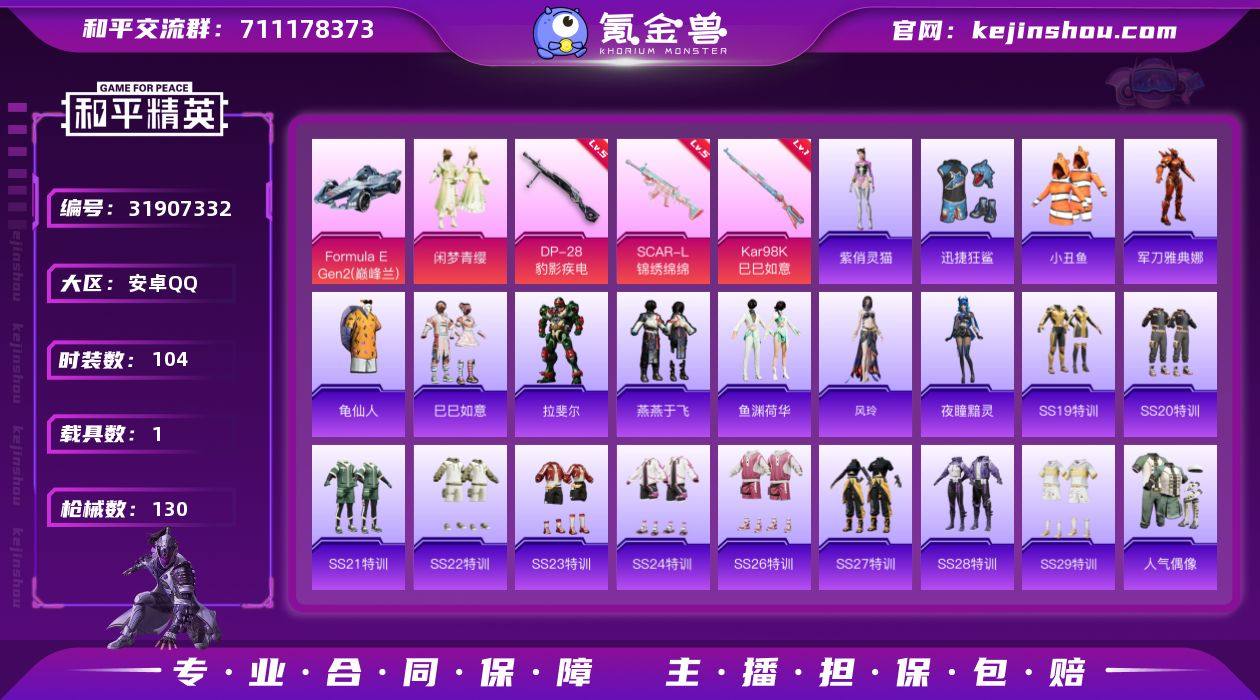 【FK6406】104套装/枪械5/装备154/载具1/战备88/王牌印记3/热力值37578/五级SCAR-L-锦绣绵绵/一级Kar98K-巳巳如意/五级Mk14-福马献瑞/二级AA12-G-萌骑幻想/五级DP-28-豹影疾电/小丑鱼/军刀雅典娜/龟仙人/闲梦青缨/Formula E Gen2(巅峰兰)/SCAR-L-锦绣绵绵/Kar98K-巳巳如意/Mk14-福马献瑞/AA12-G-萌骑幻想/DP-28-豹影疾电/沙丘之主天马飞行器/洛神天依降落伞/垂柳戏鸭降落伞/第五大道降落伞/沙丘之主降落伞/赛博古神降落伞/无垠阁降落伞/炫彩糖果降落伞/虹云熊熊降落伞/巳巳如意/套装-雪国风尚/玩偶服-小熊虫/套装-马上有钱/拉斐尔/燕燕于飞/鱼渊荷华/风玲/夜瞳黯灵/紫俏灵猫/AKM-彩虹符号/AKM-破晓战魂/M16A4-幻世战舞者/M16A4-红色方程式/M16A4-蓝色火焰/SCAR-L-炫彩节奏/SCAR-L-玉兔迎春/SCAR-L-红色方程式/M416-红色方程式/M416-蓝色火焰/GROZA-彩虹符号/GROZA-田园牧歌/GROZA-酷泡奶龙/AUG-天降萌叽/AUG-耀粉歌者/QBZ-彩虹符号/QBZ-洛神天依/M762-彩虹符号/Mk47-洛神天依/AC-VAL-天降萌叽/AC-VAL-快闪甜心/蜜獾-天降萌叽/UZI-啾咪啾咪/UZI-天降萌叽/UZI-红色方程式/UMP45-夜灯/UMP45-生命誓言/UMP45-蓝色火焰/Vector-焰鹰斗篷/Vector-生命誓言/Vector-田园牧歌/汤姆逊-环太平洋/汤姆逊-耀粉歌者/野牛-沙丘之主/P90-快闪甜心/P90-巳巳如意/Kar98K-彩虹符号/Kar98K-红色方程式/M24-炫彩节奏/AWM-焰鹰斗篷/SKS-炫彩节奏/VSS-田园牧歌/Mini14-炫彩节奏/Mini14-耀粉歌者/MK20-H-快闪甜心/S686-生命誓言/S686-红色方程式/S686-巳巳如意/S1897-炫彩节奏/S12K-破晓战魂/S12K-夜灯/S12K-幻世战舞者/DBS-焰鹰斗篷/SPAS-12-田园牧歌/M249-彩虹符号/M249-沙丘之主/M249-破晓战魂/M249-糯团青竹/DP-28-焰鹰斗篷/DP-28-彩虹符号/MG3-幻世战舞者/MG3-第五大道/短管霰弹-竹节火铳/蝎式手枪-闲梦