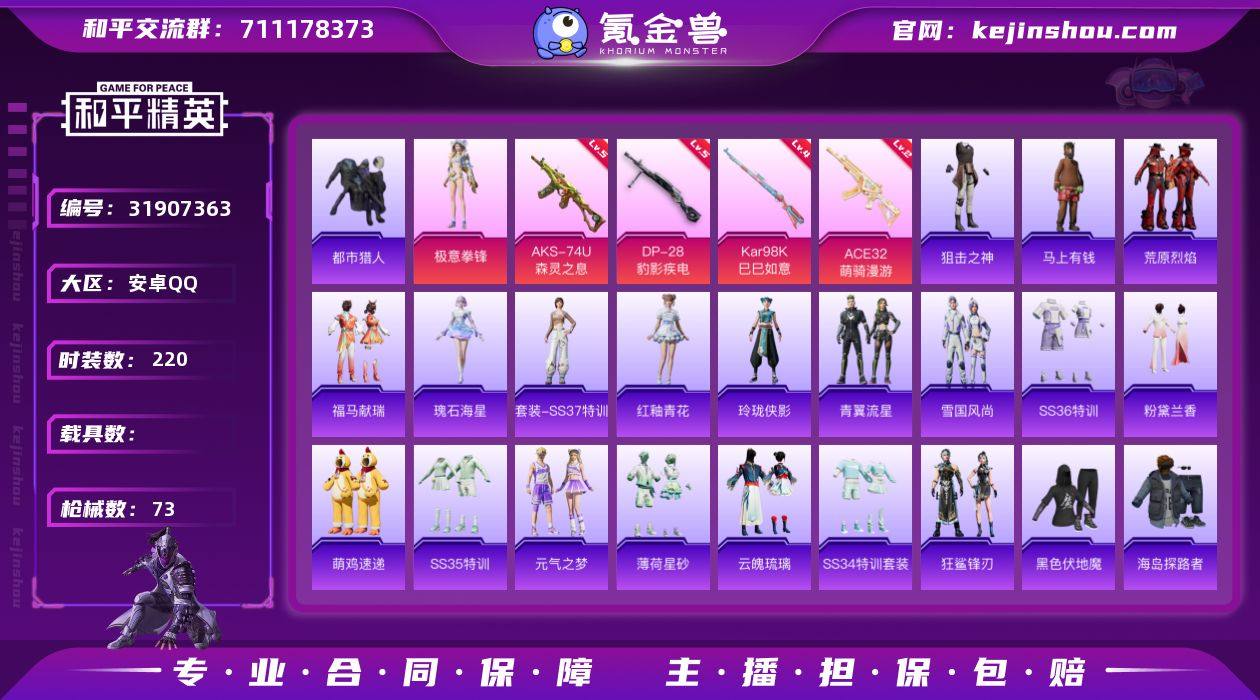 实名:不可二次实名 是否支持人脸包赔:支持 粉装数量:1 特效枪数量:4 时装数:220 枪械数:73 都市猎人 极意拳锋 五级AKS-74U-森灵之息,五级DP-28-豹影疾电,四级Kar98K-巳巳如意,二级ACE32-萌骑漫游 狙击之神,马上有钱,荒原烈焰,福马献瑞,瑰石海星,红釉青花,SS37特训,雨过天青,玲珑侠影,青翼流星,雪国风尚,SS36特训,炫彩糖果,粉黛兰香,萌鸡速递,SS35特训,元气之梦,薄荷星砂,云魄琉璃,狂鲨锋刃,SS34特训套装,冰冻风暴,缤纷果语,长空猛禽,都市猎人,海岛探路者,黑色伏地魔,黄色名流,黄色运动,红色运动,竞技名士,街头潮人,街头风暴,临安公主,蓝彩潮人,龙的传人,猎鹰,蓝色运动,漫步者,猛禽,魅力单车,柠萌假日,破蛋小黄鸡,绮丽涂鸦,人气偶像,王牌教练,耀粉歌者,鹰眼刺客,异域银装 炫彩糖果飞行器,辉云木星降落伞,罪夜之冕降落伞,绝对恒星降落伞,炫彩糖果降落伞,异瞳寒姬降落伞,荧海星豚降落伞