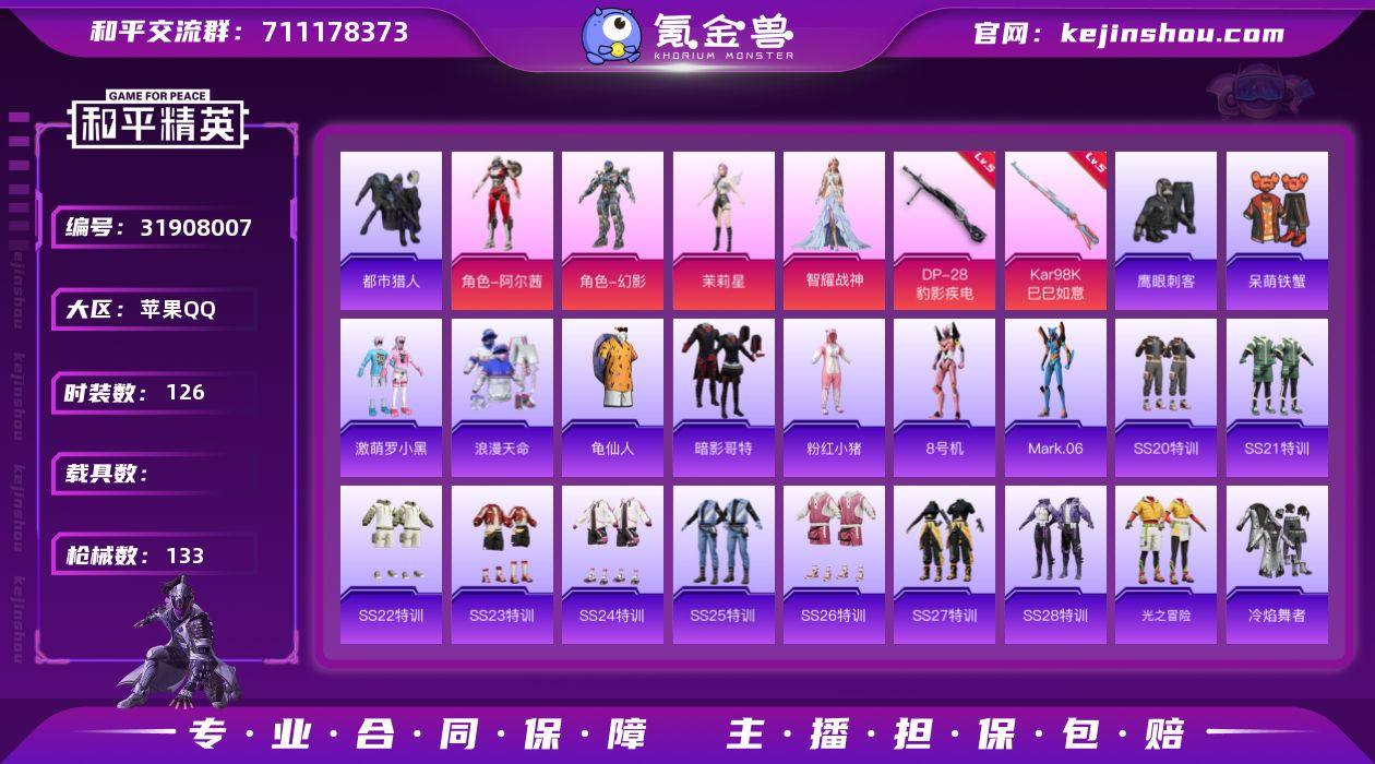 【特价出售/店主推荐】苹果 手Q-6粉装-5特效枪-0载具-3粉色飞行器-43082热力值-4王牌印记-126套装-133枪皮 【热门品类】:套装-浪漫天命,套装-都市猎人,套装-龟仙人,套装-暗影哥特,套装-粉红小猪,角色-8号机,角色-Mark.06 【粉色套装】:角色-女王,角色-阿尔茜,角色-幻影,角色-茉莉星,角色-智耀战神,角色-烬夜之誓 【粉色枪皮等级】:ACE32-萌骑漫游(二级),AKS-74U-森灵之息(五级),Kar98K-巳巳如意(五级),Mk14-福马献瑞(五级),DP-28-豹影疾电(五级) 【粉色枪皮】:ACE32-萌骑漫游,AKS-74U-森灵之息,Kar98K-巳巳如意,Mk14-福马献瑞,DP-28-豹影疾电 【粉色飞行器】:极意拳锋飞行器,辉光之愿飞行器 【粉色降落伞】:甜蜜誓约降落伞,星之彼岸降落伞,环太平洋降落伞,彩虹甜喵降落伞,超新星降落伞,圣堂之誓降落伞,初号机 觉醒Ver.降落伞,樱桃泡泡降落伞,异瞳寒姬降落伞,炫彩糖果降落伞,辉光之愿降落伞,镜花水月降落伞 【稀有套装】:套装-龟仙人,角色-罗莉,角色-X,套装-马上来财,套装-雨过天青,套装-红釉青花,角色-缚爪幽影,角色-幻步猫灵 【稀有枪皮】:AKM-影袭,AKM-星之彼岸,AKM-破晓战魂,AKM-缤纷海域,AKM-龙的传人,M16A4-幻世战舞者,SCAR-L-夜灯,SCAR-L-炫彩节奏,SCAR-L-玉兔迎春,SCAR-L-红色方程式,M416-糯团青竹,M416-蓝色火焰,GROZA-影袭,AUG-甜蜜菠萝,AUG-耀粉歌者,QBZ-彩虹符号,QBZ-未来歌姬,M762-天降萌叽,M762-彩虹符号,G36C-六号树人,AC-VAL-天降萌叽,AC-VAL-快闪甜心,蜜獾-天降萌叽,蜜獾-娇憨猪猪,UZI-啾咪啾咪,UZI-天降萌叽,UZI-娇憨猪猪,UZI-影袭,UMP45-涂山之恋,UMP45-生命誓言,UMP45-蓝色火焰,Vector-焰鹰斗篷,Vector-彩虹符号,汤姆逊-天降萌叽,汤姆逊-奇异狩猎者,汤姆逊-炫彩节奏,汤姆逊-耀粉歌者,P90-快闪甜心,Kar98...
