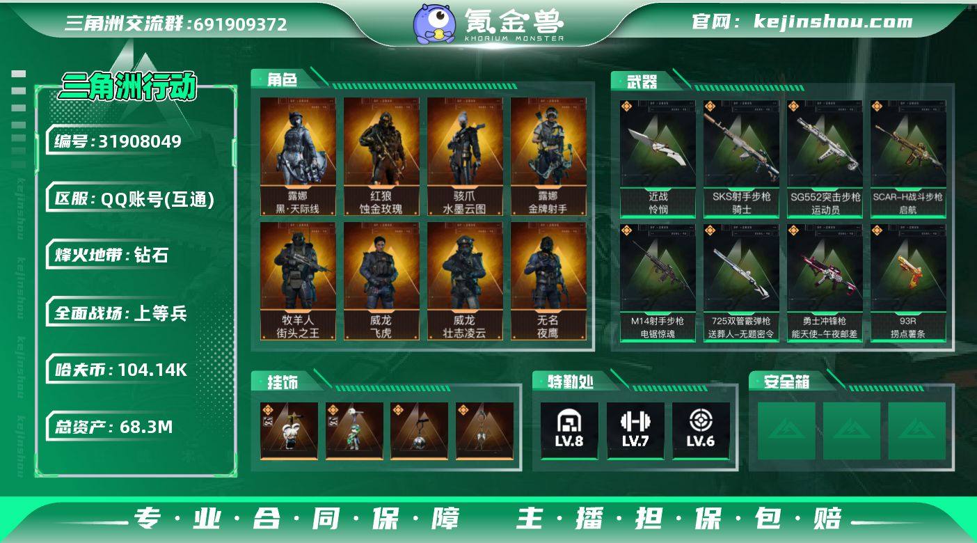 实名:不可二次实名 总资产:68.3M 哈夫币:104.14K 烽火地带段位:钻石 烽火地带等级:60 全面战场段位:上等兵 全面战场等级:50 8级仓库,7级训练中心,6级靶场,6级指挥中心,2级潜水中心,3级防具台,3级工作台,3级制药台,3级技术中心,0级收藏室 战术部门等级:3 战斗部门等级:3 医疗部门等级:3 研发部门等级:2 后勤部门等级:2 曼德尔砖-气象感应:0 曼德尔砖-命运王牌:0 曼德尔砖-电玩高手:0 曼德尔砖-美杜莎:0