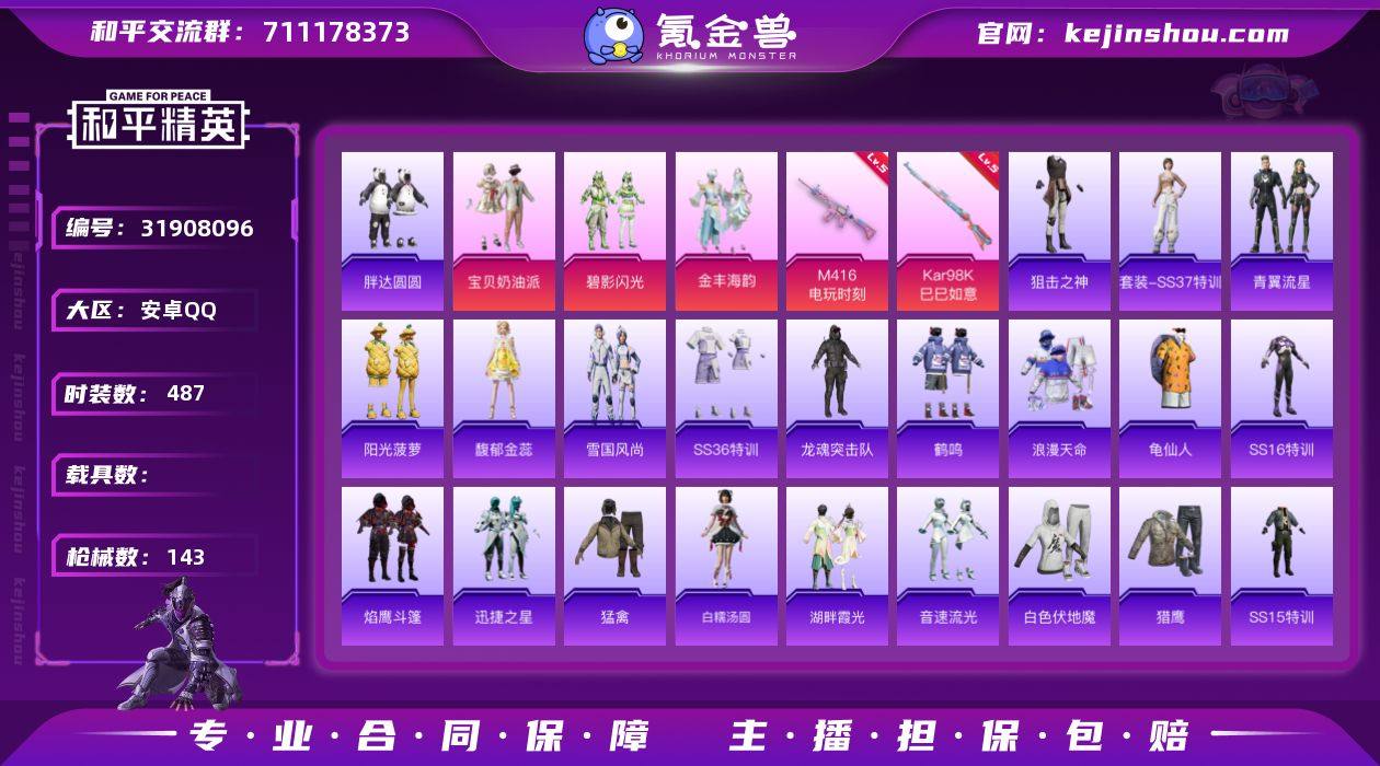 实名:可二次实名 是否支持人脸包赔:支持 粉装数量:3 特效枪数量:2 时装数:487 枪械数:143 胖达圆圆 宝贝奶油派,碧影闪光,金丰海韵 五级Kar98K-巳巳如意,五级M416-电玩时刻 狙击之神,SS37特训,青翼流星,馥郁金蕊,阳光菠萝,雪国风尚,SS36特训,暗金炫舞,暗夜契约,爱崽白熊,缤纷果语,缤纷假日,滨海假日,白糯汤圆,白色伏地魔,贝斯之夜,白熊同盟,纯白誓言,春光漫游,长空猛禽,都市魅力,飞驰魅影,风华少年志,福星高照,飞行日记,格斗先锋,龟仙人,海岛探路者,鹤鸣,虎虎生威吉莉,湖蓝色名流,湖畔霞光,黑色伏地魔,黄色伏地魔,红色运动,幻世战舞者,辉星之火,幻羽潜行,海洋之心,极地朋克,酒红色名流,竞技名士,吉莉礼服,激萌罗小黑,军械专家,空岛之星,科技之星,快闪甜心,蓝彩潮人,龙魂突击队,猎鹰,浪漫天命,蓝色运动,冷焰舞者,猛禽,萌黄之夏,魔力冰咖,魅力单车,萌趣颜团子,明鸳圣池,逆风勇士,霓虹极客,霓虹街区,浓情蜜辣,牛气满满,破蛋小黄鸡,胖达圆圆,朋克治安官,轻风白浪,青年教官,骑行爱好者,瑞龙福将,软萌银虎,丝绸行者,深蓝色名流,森林游猎者,神秘领域,SS12特训,SS13特训,SS14特训,SS15特训,SS16特训,SS17特训,SS18特训,SS19特训,SS20特训,SS21特训,SS22特训,SS24特训,SS26特训,SS27特训,SS31特训套装,SS32特训套装,SS33特训套装,甜蜜告白,甜蜜熊情侣,豚鼠丹丹,特训学院,团圆交子,田园牧歌,万圣娃娃,迅捷之星,炫蓝之夏,星梦畅游,血色贵族,雪兔飞飞,原初圣火,异彩先驱,耀粉歌者,音速流光,焰鹰斗篷,幽夜迷踪,耀眼新星,灼焰舞者,治愈之星 梦幻火箭飞行器,星之彼岸飞行器,回旋牧梦使降落伞,暗夜玫瑰降落伞,第五大道降落伞,扶摇飞仙降落伞,精灵梦叶罗丽降落伞,焦糖拿铁降落伞,恐龙拽拽降落伞,蓝莓炮弹降落伞,圣堂之誓降落伞,甜蜜誓约降落伞,银刃赛罗降落伞