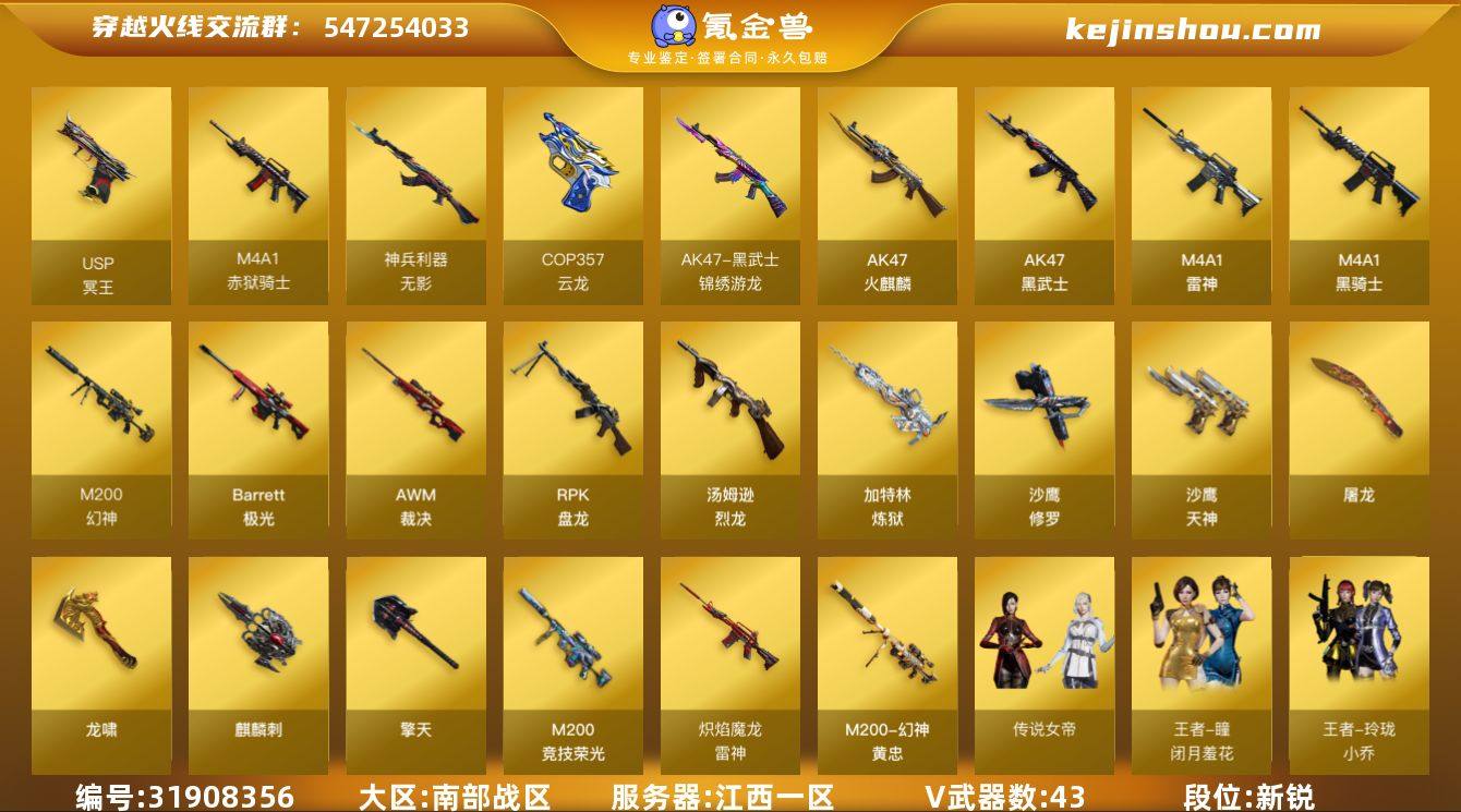 【极品女帝三角洲连体:三红角色+M7战斗步枪-棱镜攻势S2+北极星】江西一区-47V-5王者-0炫金【幻神1皮】【6烈龙+毒蜂+斯泰尔-蝴蝶】【6盘龙+炼狱-迷你小钢】【传说女帝】【M200-幻神】【M200-幻神-黄忠皮肤】【M200-竞技荣光】【AWM-裁决】【QBZ03-天罚】【王者玄武】【USP-冥王】【COP 357-云龙】【丛林匕首-玄豹】【炼狱-迷你小钢】【加特林-炼狱】【RPK-盘龙】【炼狱-悦蓝-觉醒版】【魂·炼狱-玩具枪】【汤姆逊-烈龙】【斯泰尔-蝴蝶】【毒蜂】【传说女帝】【荒漠琉璃】【奇洋探员】【沙漠玫瑰】【蛇隐宗】【王者-瞳-闭月羞花】【王者玲珑-小乔】【M4A1-雷神】【雷神-斗鱼】【雷神-炽焰魔龙】【雷神-宇航兔皮肤】【AK47-火麒麟】【M4A1-黑骑士】 【传说角色】:传说女帝 【热门武器】:M200-幻神,M200-竞技荣光,QBZ03-街机,Cat-刀锋,炼狱-迷你小钢,毒蜂,M4A1-黑骑士*2,汤姆逊-烈龙*6,RPK-盘龙*6,加特林-炼狱,斯泰尔-蝴蝶,沙鹰-修罗*3 【王者炫金武器】:王者玄武 【音效卡】:白鲨语音包 【稀有皮肤】:M200-幻神-黄忠皮肤,雷神-炽焰魔龙 【角色】:沙漠玫瑰,荒漠琉璃,荆棘,王者-瞳-闭月羞花,王者玲珑-小乔,铁骑荣耀,灵动武士,职业选手,青霞仙子,甜心偶像 【人偶武器】:斯泰尔-蝴蝶,火麒麟-灵狐,巴雷特-零-水下丽影,AWM-灵狐-15周年嘉年华,M37-葵,COP-旗袍,Cat-刀锋,炼狱-迷你小钢,迷你深渊冰龙,迷你裂空之翼,夺魂,迷你牛牛,迷你生化手雷,生化手雷-机甲核心*2,闪光弹-貂蝉,高爆手雷-大乔 【暴走生化】:斯泰尔-蝴蝶,炼狱-迷你小钢,毒蜂,超级对讲机 【挑战大师】:神圣爆裂者III,神圣爆裂者-末日III,阐释者III,激光毁灭者III,VEPR-12-金魔 【英雄级武器】:AK47-火麒麟,M4A1-雷神,M4A1-黑骑士*2,AK47-黑武士,QBZ03-天罚,无影-神兵利器,黑武士-锦绣游龙,Barrett...