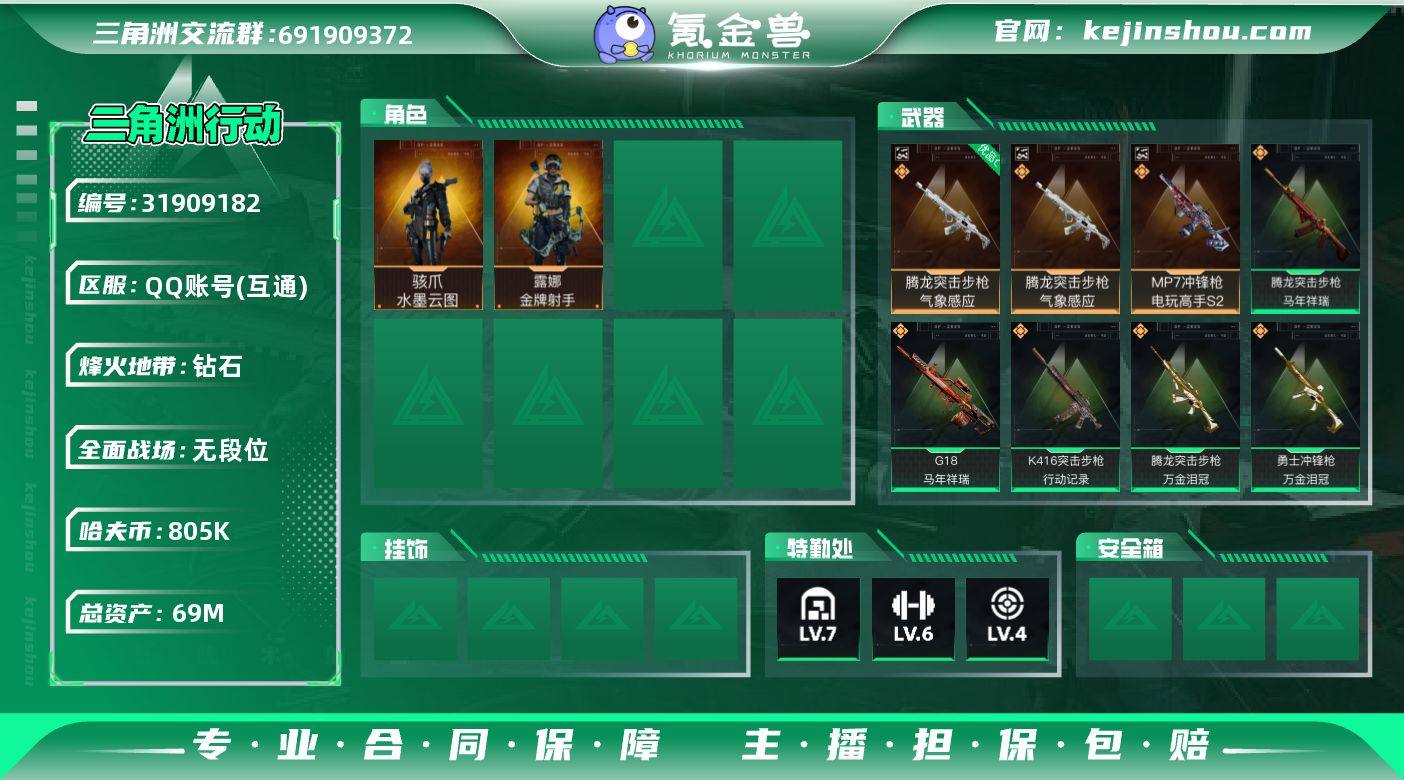 二典藏枪皮【特价出售/店主推荐】69m总资产-805k哈伏币-60烽火等级-钻石-1战场等级-无军衔 【干员外观】:骇爪-水墨云图,露娜-金牌射手 【近战皮肤】:近战-黑鹰 【典藏外观】:腾龙突击步枪-气象感应,MP7冲锋枪-电玩高手S2 【典藏外观成色】:腾龙突击步枪-气象感应(优品C),MP7冲锋枪-电玩高手S2(优品C) 【传说外观】:K416突击步枪-行动记录,SG552突击步枪-运动员,SCAR-H战斗步枪-水墨云图,SCAR-H战斗步枪-启航,腾龙突击步枪-马年祥瑞,腾龙突击步枪-万金泪冠,勇士冲锋枪-万金泪冠,M14射手步枪-蛮荒,M14射手步枪-缄花,SR-25射手步枪-缄花,AWM狙击步枪-万金泪冠,.357左轮-缄花,G18-马年祥瑞 【史诗外观】:QBZ95-1突击步枪-曙光,K416突击步枪-腊梅,AUG突击步枪-蝮蛇,M7战斗步枪-百步穿杨,SCAR-H战斗步枪-囚徒,G3战斗步枪-流沙送葬,AS Val突击步枪-百步穿杨,Vector冲锋枪-百步穿杨,SMG-45冲锋枪-阿萨拉特攻,MP7冲锋枪-六套之力,PKM通用机枪-蝮蛇,M249轻机枪-丛影谍踪,QJB201轻机枪-炽焰,VSS射手步枪-丛影谍踪,M14射手步枪-工业狂潮,M700狙击步枪-竞技风,M700狙击步枪-百步穿杨,AWM狙击步枪-流沙送葬 【稀有外观】:M4A1突击步枪-繁盛,ASh-12战斗步枪-繁盛,K416突击步枪-一帆风顺,M7战斗步枪-捣蛋鬼,SG552突击步枪-马年新春,SG552突击步枪-贴花艺术,G3战斗步枪-主宰,CAR-15突击步枪-来财,K437突击步枪-生存指令,KC17突击步枪-来财,MK47突击步枪-精英联盟,MP5冲锋枪-弄臣,MP5冲锋枪-哈夫克卫队,Vector冲锋枪-先锋,SMG-45-行动开启,SR-3M紧凑突击步枪-马年新春,勇士冲锋枪-主宰,勇士冲锋枪-冰天雪地,M1014霰弹枪-幻影结构,M249轻机枪-冰天雪地,QJB201轻机枪-哈夫克卫队,Mini-14射手步枪-荣耀列队,SR-25射手步枪-开拓,PSG-1射手步枪-主宰,SV-98狙击步枪-星链...