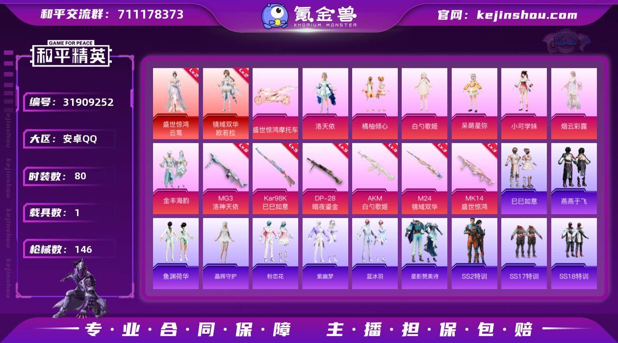 安卓 手Q-1神装-3粉装-12特效枪-2载具-4粉色飞行器-46431热力值-1王牌印记-74套装-140枪皮 【红色神装等级】:盛世惊鸿-云鸾(一级) 【红色角色神装】:盛世惊鸿-云鸾 【热门品类】:粉装-梦幻火箭,角色-军刀雅典娜,角色-Mark.06 【粉色套装】:粉装-梦幻火箭,粉装-莲影清波,角色-女娲灵识 【粉色枪皮等级】:AKM-绿萝繁花(五级),SCAR-L-梦幻火箭(一级),SCAR-L-金蛇镇世(三级),M416-至情至圣(七级),M416-电玩时刻(五级),GROZA-镜光银凌(四级),AUG-暖羊咩咩(五级),M762-青锋波束(五级),UMP45-量子极限(五级),Kar98K-巳巳如意(五级),M24-莲影清波(四级),莫辛纳甘-未来领航者(三级) 【粉色载具】:盛世惊鸿摩托车,护世瑞兽 【粉色枪皮】:AKM-绿萝繁花,SCAR-L-梦幻火箭,SCAR-L-金蛇镇世,M416-至情至圣,M416-电玩时刻,GROZA-镜光银凌,AUG-暖羊咩咩,M762-青锋波束,UMP45-量子极限,Kar98K-巳巳如意,M24-莲影清波,莫辛纳甘-未来领航者 【粉色飞行器】:梦幻火箭飞行器,齐天大圣飞行器,凤舞九天飞行器,万象金身飞行器 【粉色降落伞】:梦幻火箭降落伞,环太平洋降落伞,闲梦青缨降落伞,圣堂之誓降落伞,江南烟雨降落伞,BEARBRICK降落伞,盛世惊鸿降落伞,金蛇镇世降落伞,月下星之子降落伞 【稀有套装】:套装-巳巳如意,套装-雏菊兔兔,套装-萝兰蝴蝶,套装-小熊娃娃,套装-糖糖葫芦,套装-青团波波,套装-棉花软糖,角色-许七安,套装-燕燕于飞,套装-鱼渊荷华,角色-绛羽幽主 【稀有枪皮】:AKM-环太平洋,AKM-龙的传人,M16A4-幻世战舞者,SCAR-L-夜灯,SCAR-L-炫彩节奏,SCAR-L-红色方程式,M416-糯团青竹,M416-蓝色火焰,AUG-天降萌叽,AUG-甜蜜菠萝,AUG-耀粉歌者,AUG-金蛇镇世,QBZ-彩虹符号,QBZ-绚金瑰梦,M762-天降萌叽,M762-暖熊萌萌,Mk47-妙红点点,Mk47-炫光之旅,AC-VA...