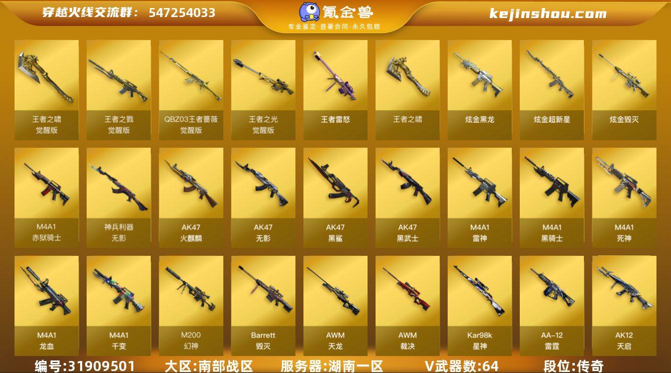 【ky5740】湖南一区-75V-18王者武器数-4炫金武器数 【热门武器】:QBZ03-金色蔷薇,Scar Light-白虎,M200-幻神,死亡之眼,Kar98K-星神,M4A1-黑骑士,汤姆逊-烈龙*6,RPK-盘龙*3,加特林-炼狱*4,斯泰尔-蝴蝶,沙鹰-修罗*8,金刚伞 【王者炫金武器】:王者雷怒,王者之啸,炫金黑龙,炫金超新星,炫金毁灭*2,王者之魄闪光弹 【音效卡】:AK47-火麒麟音效卡,M4A1-雷神音效卡,M4A1-黑骑士音效卡,AWM-裁决音效卡,Barrett-碧霄极光音效卡,死神-雪域霜狐-怀旧音效卡 【皮肤】:幻神-青鹤,幻神-AG-CFPL S24冠军 皮肤,QBZ03-AG-CFPLS19冠军,裁决-巅峰荣耀 皮肤,星神-枪娘默 皮肤,雷神-暗月,雷神-虎将,毁灭耀金皮肤,毁灭-风暴,M4A1-千变-孔明皮肤,无影耀金皮肤,战神-粉色甜心皮肤,战神-紫绶金章皮肤,AK47-B-常胜将军-曹操,AK47-B-常胜将军-孙权*2,天龙-秘银,极光-能量核心 【角色】:葵,雨棠,战地猎狐,王者樱-热浪之夏,王者春,王者玲珑-小乔,乔伊教练,修道士,空,暗夜-X,风暴女,嘉年华灵狐,灵狐者-职业经理,女战神,潘多拉-X,斯沃特-X,蜀雪,铁骑荣耀,雪莉杨-摸金校尉,影武者-X 【人偶武器】:斯泰尔-蝴蝶,斯泰尔-枪娘暗刃,AWM-灵狐-15周年嘉年华*2,COP-旗袍,迷你深渊冰龙,迷你裂空之翼*2,闪光弹-小乔,闪光弹-貂蝉,高爆手雷-大乔,M4A1-斯沃特,灵狐娃娃手雷 【暴走生化】:死亡之眼,超级对讲机 【挑战大师】:暴君乱世-超越Max,激光毁灭者III-白马银枪,激光毁灭者III,试炼破坏者III 【英雄级武器】:M4A1-千变,AK47-火麒麟,M4A1-雷神,M4A1-黑骑士,AK47-无影,M4A1-死神,AK47-黑武士*2,AK12-天启,AK47-黑鲨*2,M4A1-龙血*2,Scar Light-白虎,无影-神兵利器,QBZ03-金色蔷薇,王者之戮-觉醒版,AK-47-猩红传说,AK47-B-常胜将军,QBZ-03-王者蔷薇-觉醒版,AWM...