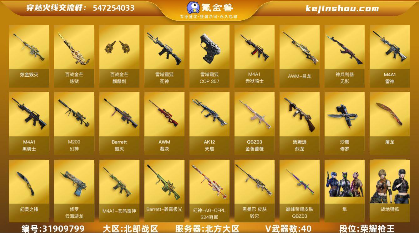 【ky5821】北方大区-51V-1王者武器数-1炫金武器数 【传说角色】:传说星骇 【热门武器】:QBZ03-金色蔷薇,M4A1-青龙,M200-幻神,死亡之眼,C.A.T,M4A1-黑骑士,汤姆逊-烈龙*5,沙鹰-修罗*2 【王者炫金武器】:炫金毁灭 【音效卡】:麒麟刺-百战金芒-盛典舞曲音效卡,炼狱-百战金芒-庆典舞曲音效卡,死神-雪域霜狐-怀旧音效卡 【皮肤】:幻神-冠军之幻,幻神-AG-CFPL S24冠军 皮肤,幻神-电竞之星 皮肤,QBZ03-巅峰荣耀皮肤,裁决-过载 皮肤,裁决-运输船 皮肤,裁决-胜者为王 皮肤,雷神-诺拉 皮肤,M4A1-再燃火线,雷神-神秘按键 皮肤,毁灭-黑曼巴 皮肤,毁灭-虹光风暴 皮肤,轻型军用手斧-再燃火线,龙啸-青青莓果 皮肤 【角色】:隼,战地猎狐,雪域霜狐,奇洋探员,乔伊教练,云海玲珑,暗夜-X,嘉年华灵狐,疾风,娟娟,兰-海滩派对,灵狐者-X,潘多拉-甜心教官,斯沃特-X,兔囡囡,雪莉杨-摸金校尉 【人偶武器】:AWM-灵狐-15周年嘉年华,C.A.T,迷你波特博士,夺魂,迷你牛牛,迷你火种,生化手雷-机甲核心,深渊终结者手雷,AK12-夜玫瑰 【暴走生化】:死亡之眼,超级对讲机 【挑战大师】:激光毁灭者III-白马银枪 【英雄级武器】:M4A1-雷神,M4A1-黑骑士,AK12-天启,M4A1-青龙,无影-神兵利器,死神-雪域霜狐,QBZ03-金色蔷薇,白虎之魄-觉醒版,Barrett-毁灭,AWM-裁决,M200-幻神,炼狱-百战金芒,汤姆逊-烈龙*5,沙鹰-修罗*2,COP 357-雪域霜狐,修罗-云海游龙,屠龙,幻灵之锋,麒麟刺-百战金芒,高爆手雷-幻灵*3,闪光弹-幻灵*3,烟雾弹-幻灵*3,M4A1-赤狱骑士,M4A1-苍鸣雷神,AWM-昌龙,Barrett-碧霄极光 【道具】:BS战队炫彩背包,CFS限定背包,云山科技背包,亚洲杯纪念炫彩背包,冰冰企鹅背包,百战金芒炫彩背包,背包-洛丽塔,虎牙炫彩背包,雪域霜狐炫彩背包,黑桃战神背包,女皇终结...