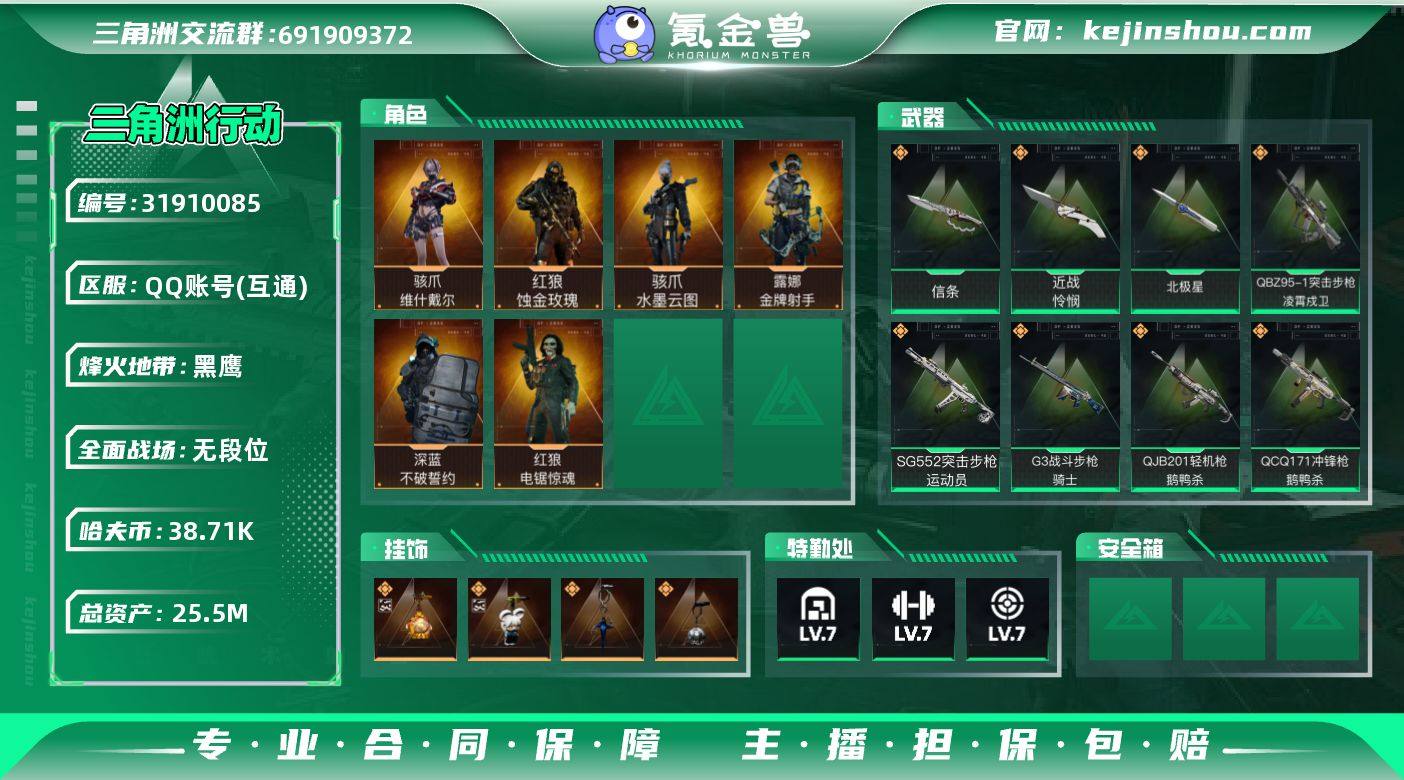 实名:可二次实名 总资产:25.5M 哈夫币:38.71K 烽火地带段位:黑鹰 烽火地带等级:60 全面战场段位:无段位 全面战场等级:6 7级仓库,7级训练中心,7级靶场,5级指挥中心,1级潜水中心,3级防具台,3级工作台,3级制药台,3级技术中心,0级收藏室 战术部门等级:2 战斗部门等级:3 医疗部门等级:3 研发部门等级:2 后勤部门等级:3 曼德尔砖-气象感应:0 曼德尔砖-命运王牌:0 曼德尔砖-电玩高手:0 曼德尔砖-美杜莎:0