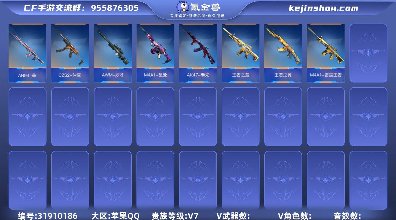 实名: 可修改 贵族等级: V8 v武器: M4A1-海骑士,AK47-血武士,M4A1-赛博雷神,AK47-雷麒麟,M4A1-七色宝葫,AK47-沙漠郡主-超觉,AK47-猩红传说,QBZ19-天使,AK47-亚龙,M4A1-龙血,AK47-机械迷城,擎天,剑齿虎-炫彩,M4A1-游骑兵,M4A1-天使,M4A1-玫瑰精灵,M4A1-死神,M4A1-黑龙,AK47-麒麟,M4A1-雷神,AK47-火麒麟,MR1-龙吟惊沧海,M200-幻神,98K-黑骑士,巴雷特-极光,巴雷特-毁灭,AWM-天龙,加特林-蟒蛇,MG36-黑骑士,MK5-极光,双持斯泰尔-天使,AA12-雷神,地狱烈炎,地狱火,QSZ92-天使,双持柯尔特-极光,双持沙鹰-亚龙,沙鹰-天神,USP-神罚,沙鹰-修罗,双截棍-天使,蝴蝶刀-极光,双持尼泊尔-亚龙,星芒,麒麟刺,神罚战斧,马来剑-毁灭,耀金雷刃,尼泊尔-火麒麟,屠龙,龙啸,M4A1-运输船,SCAR-幽暗骑士,加特林-堡垒,CZS2-心动次元,KSG-天使,丛林匕首-庆龙觉醒,QCW05-变形金刚·大黄蜂,秋逸,Mk47-鼓龙,SCAR-探星者,QSZ92-华夏传说,末日裁决者,9A91-魔蜥觉醒,蝴蝶刀-天神,AN94-赳赳秦师,M4A1-夏清,AK47-木兰,百战巾帼枪,唐刀-华夏传说,9A91-天神,AK47-谜城烟火,HK417-朱雀,XM8-湮灭,沙鹰-宇航兔兔,女皇利刃-铁胆虎魄,龙鳞-觉醒,QBZ191-封神榜,蟒蛇-鼓龙,马来剑-耀金伯爵,破邪蛇棍觉醒,SCAR-心动PICK,掠夺者P365-虹舞,G3A3-衍神兵,末日裁决觉醒,KSG-钟馗觉醒,QBZ03-天罚 王者武器: 王者之势,王者之翼,王者之影,王者之心,王者之光,王者之电,王者之魂,王者之刺,王者之锋,王者之啸,QBZ03-王者蔷薇 v角色: 蝴蝶,葵,零,审判者 枪械皮肤: 丛林匕首-庆龙觉醒-千变