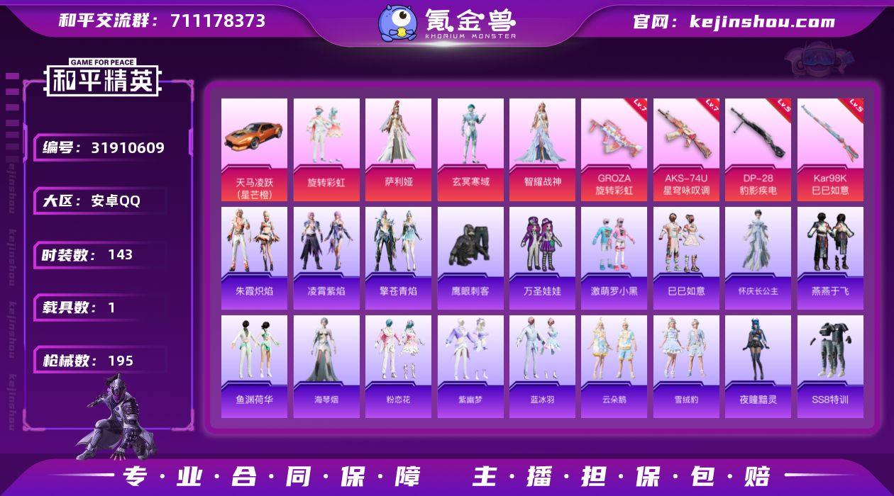 【as35】安卓 手Q-4粉装-4特效枪-1载具-2粉色飞行器-58352热力值-8王牌印记-143套装-195枪皮 【粉色套装】:粉装-旋转彩虹,角色-萨利娅,角色-玄冥寒域,角色-智耀战神 【粉色枪皮等级】:GROZA-旋转彩虹(七级),AKS-74U-星穹咏叹调(七级),Kar98K-巳巳如意(五级),DP-28-豹影疾电(五级) 【粉色载具】:天马凌跃(星芒橙) 【粉色枪皮】:GROZA-旋转彩虹,AKS-74U-星穹咏叹调,Kar98K-巳巳如意,DP-28-豹影疾电 【粉色飞行器】:春暖花开飞行器,太空嘟嘟飞行器 【粉色降落伞】:梦幻火箭降落伞,香水柠檬降落伞,垂柳戏鸭降落伞,旋转彩虹降落伞,圣堂之誓降落伞,精灵梦叶罗丽降落伞,金蛇镇世降落伞,鬼刀降落伞,圣域龙灵降落伞,圣斗士星矢降落伞 【稀有套装】:套装-巳巳如意,角色-怀庆长公主,套装-燕燕于飞,套装-鱼渊荷华,角色-海琴烟,套装-粉恋花,套装-紫幽梦,套装-蓝冰羽,套装-云朵鹅,套装-雪绒豹,角色-夜瞳黯灵,套装-朱霞炽焰,套装-凌霄紫焰,套装-擎苍青焰 【稀有枪皮】:AKM-夜灯,AKM-影袭,AKM-灼热熔岩,AKM-破晓战魂,AKM-虎虎生威,AKM-霓虹街区,M16A4-幻世战舞者,M16A4-红色方程式,M16A4-蓝色火焰,SCAR-L-炫彩节奏,SCAR-L-玉兔迎春,SCAR-L-红色方程式,M416-夜灯,M416-糯团青竹,M416-红色方程式,M416-蓝色火焰,GROZA-异彩先驱,GROZA-彩虹符号,GROZA-影袭,GROZA-治愈之星,GROZA-田园牧歌,AUG-天降萌叽,AUG-甜蜜菠萝,AUG-耀粉歌者,AUG-青春冒险家,AUG-月影灵韵,QBZ-原初圣火,QBZ-彩虹符号,M762-天降萌叽,M762-牛气冲天,M762-瑞龙福将,M762-镭射皇者,M762-云朵鹅,AC-VAL-天降萌叽,蜜獾-天降萌叽,蜜獾-娇憨猪猪,ARX-凌霄紫焰,UZI-啾咪啾咪,UZI-天降萌叽,UZI-娇憨猪猪,UZI-影袭,UZI-炫彩节奏,UZI-红色方程式,UMP45-仲夏莫吉托,UMP45-夜灯,UMP45...