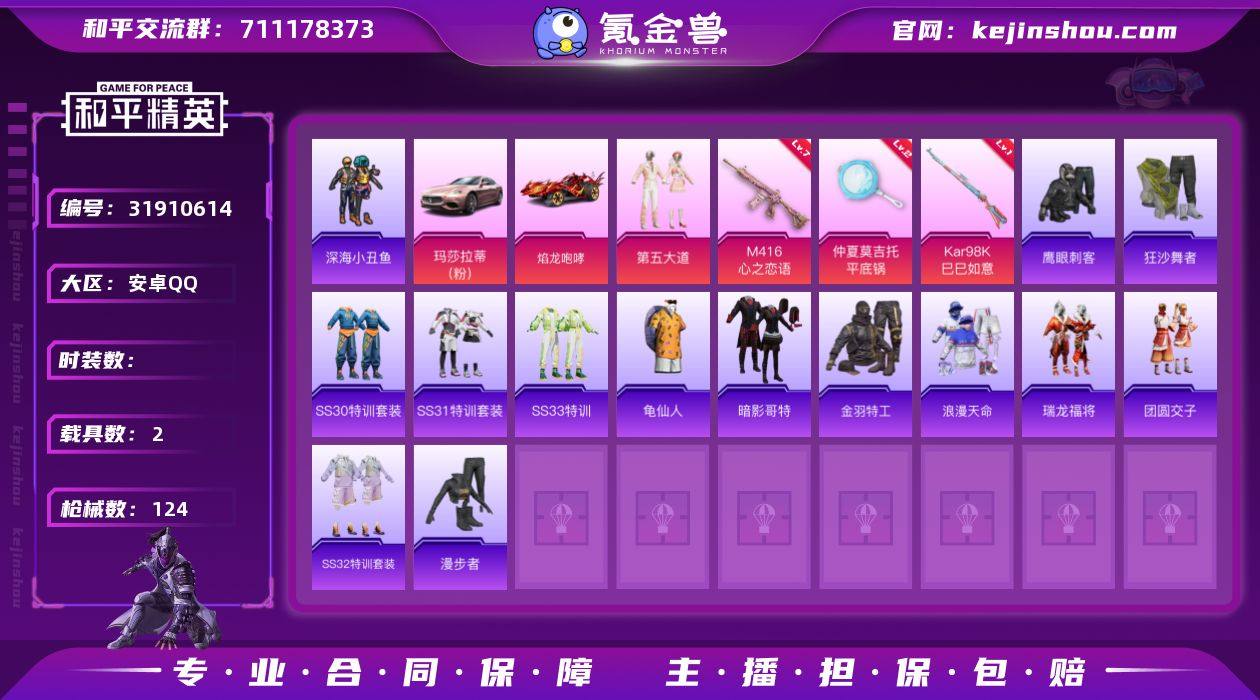 安卓Q 不可二次 ss24战神框2载具1粉装3特效枪12热门95套装124枪皮 41613热力值 7印记 历史无敌战神 浪漫天命 【2载具】 玛莎拉蒂粉色 焰龙咆哮 【1粉装】 第五大道 【3特效枪】 M416-心之恋语 (7级) Kar98K-巳巳如意 (1级) 平底锅-仲夏莫吉托 (2级) 【12热门】 龟仙人 鹰眼刺客 深海小丑鱼 金羽特工 NV战队服 暗影哥特 团圆交子 瑞龙福将 狂沙舞者 漫步者 M762-瑞龙福将 M24-奇异狩猎者 和平精英账号