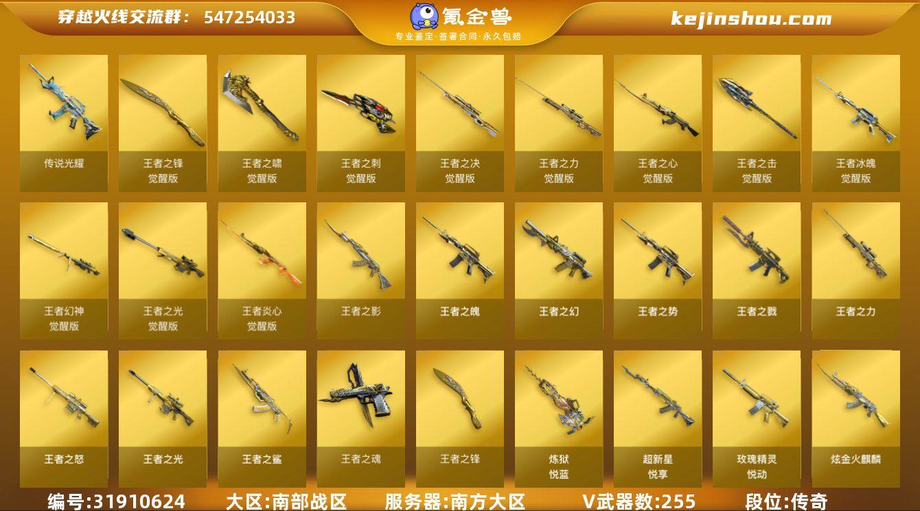 南方大区-264V-47王者-19炫金 【传说武器】:传说光耀 【热门武器】:传说光耀,QBZ03-金色蔷薇*2,Scar Light-白虎,HK417-朱雀,M4A1-青龙,M200-幻神,死亡之眼*2,Kar98K-星神,Cat-刀锋,M4A1-黑骑士*6,汤姆逊-烈龙*8,RPK-盘龙*6,加特林-炼狱*10,斯泰尔-蝴蝶*2,羊驼玩偶,降世魔童,火麒麟-绝迹,USP-雷暴*2,COP-堕天神*3,沙鹰-修罗*6,金刚伞 【王者炫金武器】:王者之鲨,王者之戮*3,超新星-悦享*2,王者之幻*2,王者之势,玫瑰精灵-悦动,王者之影,王者之魄*3,王者之光*2,王者之怒*5,王者之力,炼狱-悦蓝,王者之魂*3,王者之锋*4,炫金火麒麟,炫金骑士*3,炫金黑龙,炫金千变,炫金雷神*3,炫金武士*2,炫金超新星*2,炫金毁灭*3,炫金天龙*3,王者之魄高爆手雷 【音效卡】:M200-幻神音效卡,AK47-火麒麟音效卡*3,M4A1-雷神音效卡,M4A1-黑龙音效卡,M4A1-黑骑士音效卡,Barrett-毁灭音效卡,Barrett-极光音效卡 【皮肤】:裁决-过载 皮肤,裁决-胜者为王 皮肤,雷神-荣耀之魄,雷神-星空*4,M4A1-雷神-CFS 2019,雷神-虎将,雷神-冠军之魄,雷神-传奇N9,火麒麟-冠军之心,火麒麟-华夏之心,AK47-火麒麟-传奇EVEN,火麒麟-战神关羽,毁灭-荣耀之怒,毁灭耀金皮肤*3,毁灭-星空,毁灭-CFS2020,黑龙-能量核心,M4A1-黑龙-361,黑龙-冠军之武,黑骑士耀金皮肤,黑骑士-冠军之势,黑骑士-地狱火,黑骑士-战神马超,无影耀金皮肤*2,无影-霓裳皮肤,AK47-黑武士-361,AK47-B-常胜将军-曹操,AK47-B-常胜将军-刘备,AK47-B-常胜将军-孙权,天龙-能量核心,AWM-天龙-传奇70KG,AWM-天龙-传奇白鲨*4,极光-能量核心*2,炼狱-星空,修罗-能量核心*2,修罗-星空*4,屠龙-荣耀之锋,龙啸-冠军之啸,擎天-冠军之击,麒麟刺-甜蜜糖果 皮肤 【角色】:零,葵,樱,瞳,魅影,炫,迷迭香,凌霄,审判者...