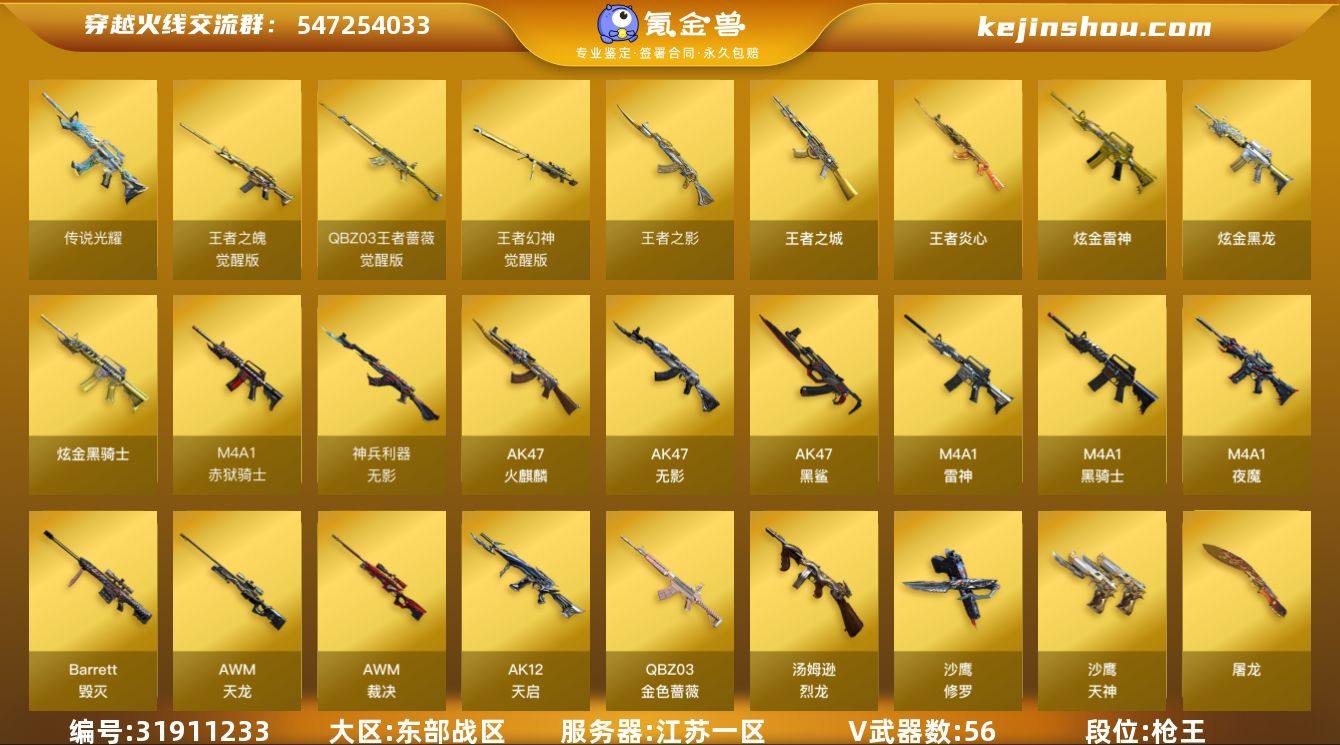 江苏一区-58V-8王者-4炫金 【传说武器】:传说光耀 【热门武器】:传说光耀,QBZ03-金色蔷薇,王者炎心,C.A.T,M4A1-黑骑士,汤姆逊-烈龙*6,斯泰尔-蝴蝶,火麒麟-绝迹,沙鹰-修罗*3 【王者炫金武器】:王者之城,王者炎心,王者之影,炫金骑士,炫金黑龙,炫金雷神*2 【音效卡】:M4A1-雷神音效卡,M4A1-黑骑士音效卡,Barrett-毁灭音效卡 【皮肤】:幻神-电流骇客 皮肤,雷神-暗月,雷神-星空,雷神-传奇N9,毁灭耀金皮肤,毁灭-英雄计划 皮肤,黑龙-能量核心,黑骑士-暗月,战神-粉色甜心皮肤,AK47-B-常胜将军-曹操,AK47-B-常胜将军-刘备,AWM-天龙-传奇白鲨 【角色】:迷迭香,王者玲珑-小乔,蛇隐宗,云海玲珑,初恋灵狐,芳心审判者,潘多拉-X,潘多拉-甜心教官,蛇姬 【人偶武器】:火麒麟-绝迹,迷你救赎猎手,斯泰尔-蝴蝶,C.A.T,迷你牛魔王,迷你生化手雷 【暴走生化】:超级对讲机 【挑战大师】:冰龙粉碎者-白马银枪 【英雄级武器】:AK47-火麒麟,M4A1-雷神,M4A1-黑骑士,AK47-无影,AK12-天启,AK47-黑鲨,M4A1-夜魔,无影-神兵利器,QBZ03-金色蔷薇,王者之魄-觉醒版*2,QBZ-03-王者蔷薇-觉醒版,AWM-天龙*2,Barrett-毁灭,AWM-裁决,王者幻神-觉醒版,汤姆逊-烈龙*6,沙鹰-修罗*3,沙鹰-天神,柯尔特-竞技荣光,破空枪刃-夜魔,屠龙,龙啸*2,马来剑-夜魔,擎天,斩神刀-雷暴,高爆手雷-雷暴,高爆手雷-夜魔*5,高爆手雷-竞技荣光,高爆手雷-古蛇迷踪,闪光弹-雷暴,闪光弹-夜魔*5,闪光弹-竞技荣光,烟雾弹-雷暴,烟雾弹-夜魔*5,烟雾弹-竞技荣光,烟雾弹-古蛇迷踪,M4A1-赤狱骑士 【道具】:BS战队炫彩背包,CFS限定背包,炫彩背包-诺拉,炫彩背包,超级背包,救世主-黑桃战神,妩媚妖姬,绿色巨人,灵魂忍者,迷雾幽灵,夺命之镰,防化服*2,金色流光-枪王排位,星辰流光-枪王排位,流光...