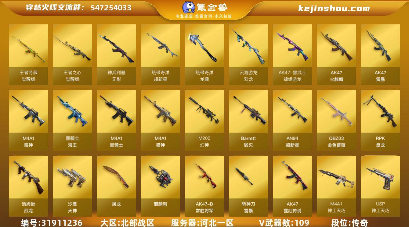 【ky5978】河北一区-113V-2王者武器数-0炫金武器数 【热门武器】:QBZ03-金色蔷薇,M4A1-青龙,M200-幻神,M4A1-黑骑士*4,汤姆逊-烈龙,RPK-盘龙,斯泰尔-蝴蝶,USP-雷暴 【音效卡】:AN94-超新星-热带奇洋音效卡,M4A1-黑骑士音效卡 【皮肤】:QBZ03-AG-CFPLS19冠军,雷神-维纳斯皮肤,雷神-源计划2.0专属 皮肤,火麒麟-平天大圣,火麒麟-百城,火麒麟-心动糖果,M4A1-千变-孔明皮肤,黑骑士-暗月,战神-粉色甜心皮肤,战神-流金岁月皮肤,AK47-B-常胜将军-刘备,AK47-B-常胜将军-孙权,麒麟刺-甜蜜糖果 皮肤,麒麟刺-萌杀皮肤 【角色】:春,兰-巾帼英雄,隼,王者-魅影,奇洋探员,乔伊教练,云海玲珑,北极狐-X,电竞少女,飞虎队-X,风暴女*2,虎妞,嘉年华灵狐,娟娟,灵狐-花神,灵狐者-X,灵狐者-黄金海岸,灵狐者-职业经理,麻雀,曼陀罗-X,曼陀罗-礼服,萌儿,潘多拉-X,斯沃特-X,蜀雪,维纳斯,新娜塔莎,雪莉杨-摸金校尉,夜玫瑰-幻能朋克,夜玫瑰-宠粉,樱-战斗天使,影武者-X,游珑儿 【人偶武器】:天龙-曼陀罗,斯泰尔-蝴蝶,Barrett-云海玲珑,AWM-灵狐-15周年嘉年华*2,迷你深渊冰龙*3,迷你裂空之翼*2,迷你牛魔王,迷你波特博士*2,夺魂,迷你牛牛,迷你火种*2,生化手雷-机甲核心,深渊终结者手雷*3,迷你巨石泰坦-魔花研究所,灵狐娃娃手雷 【暴走生化】:超级对讲机 【挑战大师】:暴君乱世-超越Max,神圣爆裂者III*2,冰龙粉碎者-白马银枪*2,激光毁灭者III-白马银枪*3,激光毁灭者III,机甲撕裂者III,试炼破坏者III,KAC-圣炎切割者III,神圣爆裂者-末日III,惩戒者III 【英雄级武器】:AK47-火麒麟,M4A1-雷神,M4A1-黑骑士*4,AN94-超新星,AK47-雷暴,M4A1-青龙,QBZ03-天罚,M4A1-神工天巧,无影-神兵利器,黑武士-锦绣游龙,超新星-热带奇洋,QBZ03-金色蔷薇,M4A1-猎神,烈火-...