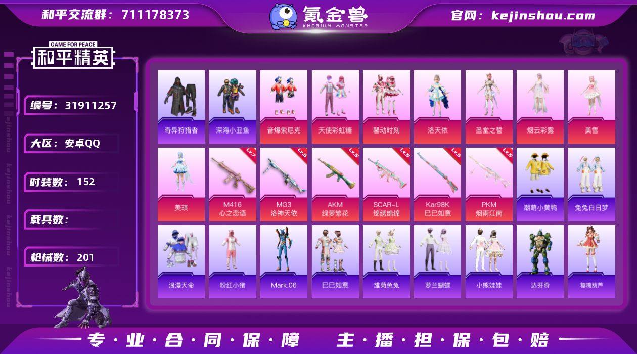 【kyhp199】安卓 手Q-9粉装-6特效枪-0载具-3粉色飞行器-63933热力值-8王牌印记-152套装-201枪皮 【热门品类】:粉装-音爆索尼克,套装-浪漫天命,套装-深海小丑鱼,套装-奇异狩猎者,套装-潮萌小黄鸭,套装-粉红小猪,角色-Mark.06 【粉色套装】:粉装-天使彩虹糖,粉装-馨动时刻,角色-洛天依,粉装-音爆索尼克,角色-圣堂之誓,角色-烟云彩露,角色-美雪,角色-美琪,角色-罪夜之冕 【粉色枪皮等级】:AKM-绿萝繁花(五级),SCAR-L-锦绣绵绵(五级),M416-心之恋语(七级),Kar98K-巳巳如意(五级),MG3-洛神天依(六级),PKM-江南烟雨(五级) 【粉色枪皮】:AKM-绿萝繁花,SCAR-L-锦绣绵绵,M416-心之恋语,Kar98K-巳巳如意,MG3-洛神天依,PKM-江南烟雨 【粉色飞行器】:青春物语飞行器,星夜魔法师飞行翼,冠军兔兔飞行器 【粉色降落伞】:快乐主宰降落伞,四圣焕新降落伞,洛神天依降落伞,旋转彩虹降落伞,炫光之旅降落伞,镜光幻境降落伞,圣堂之誓降落伞,小叽联名款降落伞,江南烟雨降落伞,精灵梦叶罗丽降落伞,拳皇·狂花道降落伞,炫彩糖果降落伞 【稀有套装】:套装-巳巳如意,套装-雏菊兔兔,套装-萝兰蝴蝶,套装-小熊娃娃,角色-达芬奇,套装-糖糖葫芦,套装-青团波波,套装-棉花软糖,角色-摩登魅猫,角色-月烬之祷 【稀有枪皮】:AKM-夜灯,AKM-彩虹符号,AKM-江南烟雨,AKM-灼热熔岩,AKM-破晓战魂,AKM-萌趣颜团子,AKM-霓虹街区,M16A4-蓝色火焰,SCAR-L-夜灯,SCAR-L-炫彩节奏,SCAR-L-红色方程式,M416-夜灯,M416-摩登王国,M416-糯团青竹,M416-红色方程式,M416-蓝色火焰,GROZA-懵萌河马,GROZA-生命誓言,GROZA-田园牧歌,AUG-天降萌叽,AUG-耀粉歌者,QBZ-彩虹符号,QBZ-洛神天依,M762-天降萌叽,M762-暗夜鎏金,M762-烈焰拳霸,M762-牛气冲天,Mk47-妙红点点,Mk47-洛神天依,Mk47-百万伏...