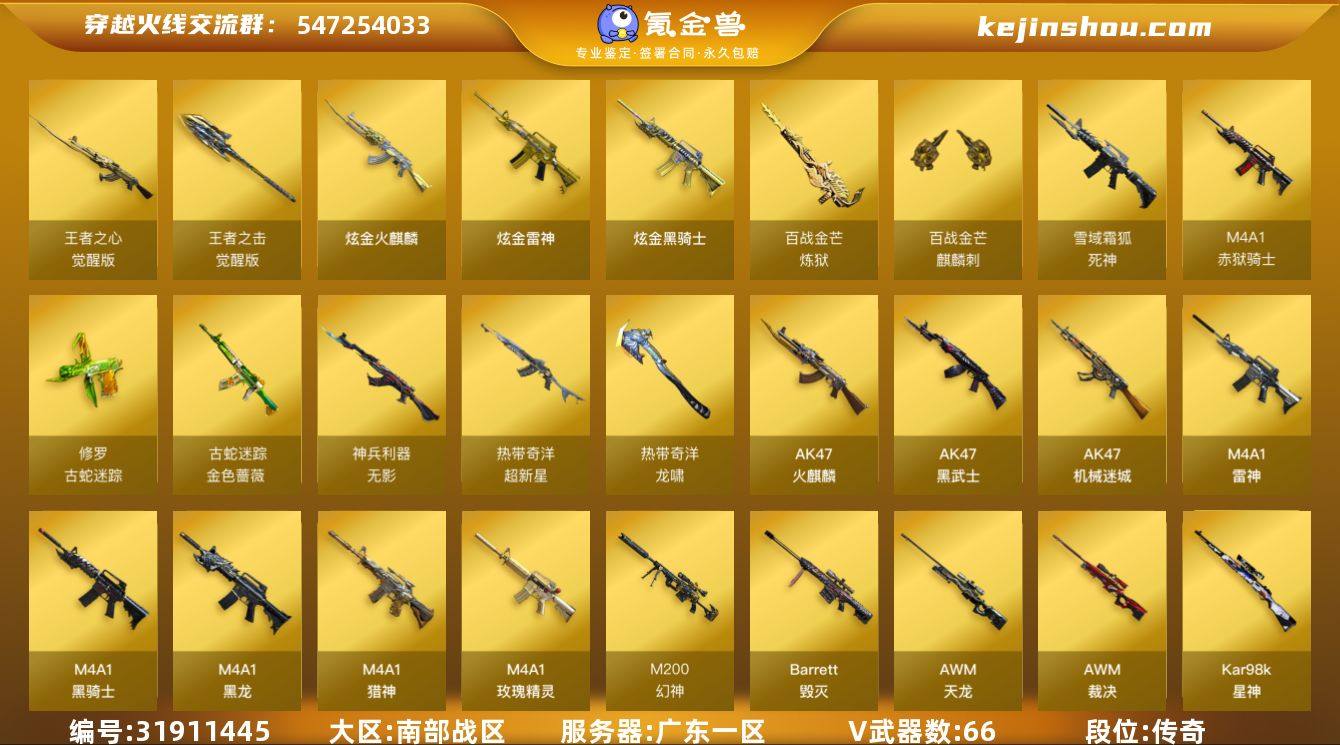 广东一区-70V-6王者-3炫金 【热门武器】:QBZ03-金色蔷薇,M200-幻神,金色蔷薇-古蛇迷踪,修罗-古蛇迷踪,Kar98K-星神,金色小号,Cat-刀锋,M4A1-黑骑士,汤姆逊-烈龙*6,加特林-炼狱*3,斯泰尔-蝴蝶,USP-雷暴,沙鹰-修罗*4,Knife-冠军之刃*2,炽芒蝶刃,炽芒蝶刃-冠军炽芒皮肤 【王者炫金武器】:炫金火麒麟,炫金骑士,炫金雷神 【音效卡】:屠龙-动感闪耀 音效卡,天神-动感闪耀 音效卡,烈火-动感闪耀 音效卡,M4A1-雷神音效卡,M4A1-黑骑士音效卡,Barrett-毁灭音效卡,Barrett-碧霄极光音效卡,炼狱-百战金芒-庆典舞曲音效卡,死神-雪域霜狐-怀旧音效卡,AWM-昌龙-怀旧音效卡 【皮肤】:幻神-动感闪耀 皮肤,幻神-星火小队签名臻藏版 皮肤,幻神-曹操 皮肤,星神-漫游,雷神-暗月,雷神-虎将,雷神-耀金皮肤,雷神-R.LGD-CFPLS18冠军,雷神-动感闪耀 皮肤,雷神-源计划2.0专属 皮肤,M4A1-再燃火线,雷神-神秘按键 皮肤,火麒麟-华夏之心,火麒麟-平天大圣,火麒麟-盘古,火麒麟-心动糖果,毁灭耀金皮肤,黑龙-能量核心,黑骑士-暗月,黑骑士-破浪10年皮肤,幻影-破浪逐光 皮肤,天龙-秘银,修罗-能量核心,修罗-星空,修罗-冠军之魂,轻型军用手斧-再燃火线,炽芒蝶刃-冠军炽芒皮肤 【角色】:葵,晴雅,战地猎狐,王者凌霄,雪域霜狐,蛇隐宗,奇洋探员,乔伊教练,炽天使,暗夜-X,初恋灵狐,飞虎队-X,风暴女,嘉年华灵狐,娟娟,灵狐者-X,麻雀,女战神,潘多拉-X,蛇姬,斯沃特-X,铁骑荣耀,新娜塔莎,雪莉杨,影武者-X,职业选手 【人偶武器】:火麒麟-灵狐,斯泰尔-蝴蝶,AWM-灵狐-15周年嘉年华,海滩汪汪-巴雷特,Cat-刀锋,迷你牛魔王,迷你波特博士,夺魂,生化手雷-机甲核心*3,深渊终结者手雷,M4A1-斯沃特 【暴走生化】:超级对讲机 【挑战大师】:神圣爆裂者III,冰龙粉碎者-白马银枪,...