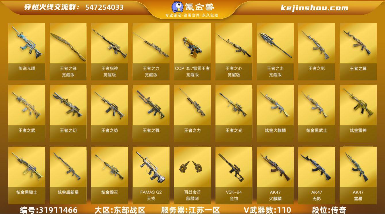 【ky5991】江苏一区-121V-16王者武器数-6炫金武器数 【传说武器】:传说光耀 【热门武器】:传说光耀,QBZ03-金色蔷薇,Scar Light-白虎,HK417-朱雀,M200-幻神,死亡之眼,荣耀世冠-雷神,荣耀世冠-柯尔特,Kar98K-星神,M4A1-黑骑士*3,汤姆逊-烈龙*6,RPK-盘龙*7,加特林-炼狱*6,斯泰尔-蝴蝶,USP-雷暴*2,沙鹰-修罗*4 【王者炫金武器】:王者之戮,王者之幻,王者之翼,王者之势,王者之武,王者之影,王者之光,王者之力,王者冰锋,炫金火麒麟,炫金骑士,炫金雷神,炫金武士,炫金超新星,炫金毁灭 【音效卡】:AK47-火麒麟音效卡,M4A1-雷神音效卡,M4A1-黑龙音效卡,M4A1-黑骑士音效卡,Barrett-毁灭音效卡,AWM-裁决音效卡,QBZ03-天罚音效卡,Barrett-碧霄极光音效卡,炼狱-百战金芒-庆典舞曲音效卡 【皮肤】:裁决-运输船 皮肤,雷神-星空,M4A1-雷神-CFS 2019,火麒麟-冠军之心,火麒麟-平天大圣,毁灭耀金皮肤,毁灭-星空,黑龙-能量核心,M4A1-黑龙-361,黑骑士耀金皮肤,无影耀金皮肤,战神-紫绶金章皮肤,战神-流金岁月皮肤,AWM-天龙-传奇白鲨,极光-能量核心,炼狱-星空,修罗-能量核心,屠龙-荣耀之锋,屠龙-荣耀世冠AG,轻型军用手斧-再燃火线 【角色】:葵,魅影,春,机械姬,零·纪元,王者-瞳-闭月羞花,王者-零,王者之瞳,王者玲珑,王者-魅影,葵-阿尔法武装,空,暗夜-X,北极狐-X,初恋灵狐,风暴女,娟娟,兰-海滩派对,兰妹妹,零-水下丽影,灵狐者-黄金海岸,龙儿-小淘气,潘多拉-X,潜龙队-X,斯沃特-X,蜀雪,铁骑荣耀,兔囡囡,新灵狐者,新娜塔莎 【人偶武器】:天龙-曼陀罗,M4A1-雷神-精英刀锋,斯泰尔-蝴蝶,COP-旗袍,迷你深渊冰龙*2,迷你裂空之翼,夺魂*2,迷你牛牛*2,迷你生化手雷,生化手雷-机甲核心,深渊终结者手雷,闪光弹-小乔,迷你艾比 【暴走生化】:死亡...