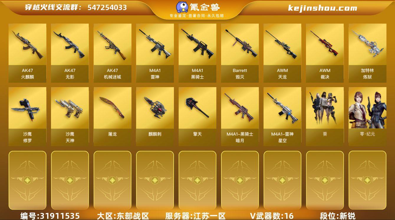 【ky6040】江苏一区-17V-0王者武器数-0炫金武器数 【热门武器】:死亡之眼,M4A1-黑骑士,加特林-炼狱,沙鹰-修罗 【皮肤】:雷神-星空,黑骑士-暗月,极光-能量核心*2 【角色】:葵,零·纪元,乔伊教练,修道士,风暴女,虎妞,嘉年华灵狐,娟娟,龙儿,潘多拉-甜心教官,斯沃特-X,兔囡囡,樱-战斗天使 【人偶武器】:AWM-灵狐-15周年嘉年华,迷你牛牛,生化手雷-机甲核心,灵狐娃娃手雷 【暴走生化】:死亡之眼 【挑战大师】:激光毁灭者III 【英雄级武器】:AK47-火麒麟,M4A1-雷神*2,M4A1-黑骑士,AK47-无影,AK47-机械迷城,AWM-天龙*2,Barrett-毁灭,AWM-裁决,加特林-炼狱,沙鹰-修罗,沙鹰-天神,屠龙,擎天,麒麟刺 【道具】:战舰背包,炫彩背包,超级背包,女皇终结者-魔龙之吻,绿色巨人,灵魂忍者,迷雾幽灵,夺命之镰,防化服*2,金色流光-枪王排位,流光-鎏金之域,防弹头盔*2,防弹衣*2,C4工具钳*2,手雷包*2 【特殊枪械】:1黑骑士,1炼狱