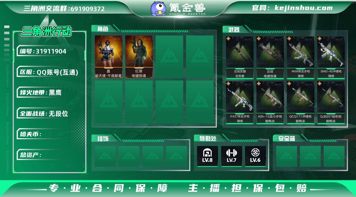hf14179总资产298m+s8赛季3x3安全箱+午夜邮差全套+电锯惊魂红狼全套+处刑者刀+电锯惊魂全套+鹅鸭杀全套+狩猎时刻全套+特斯拉线圈全套+锦绣全套+烽火等级60+特勤部门等级可以+守信不予+永久包赔