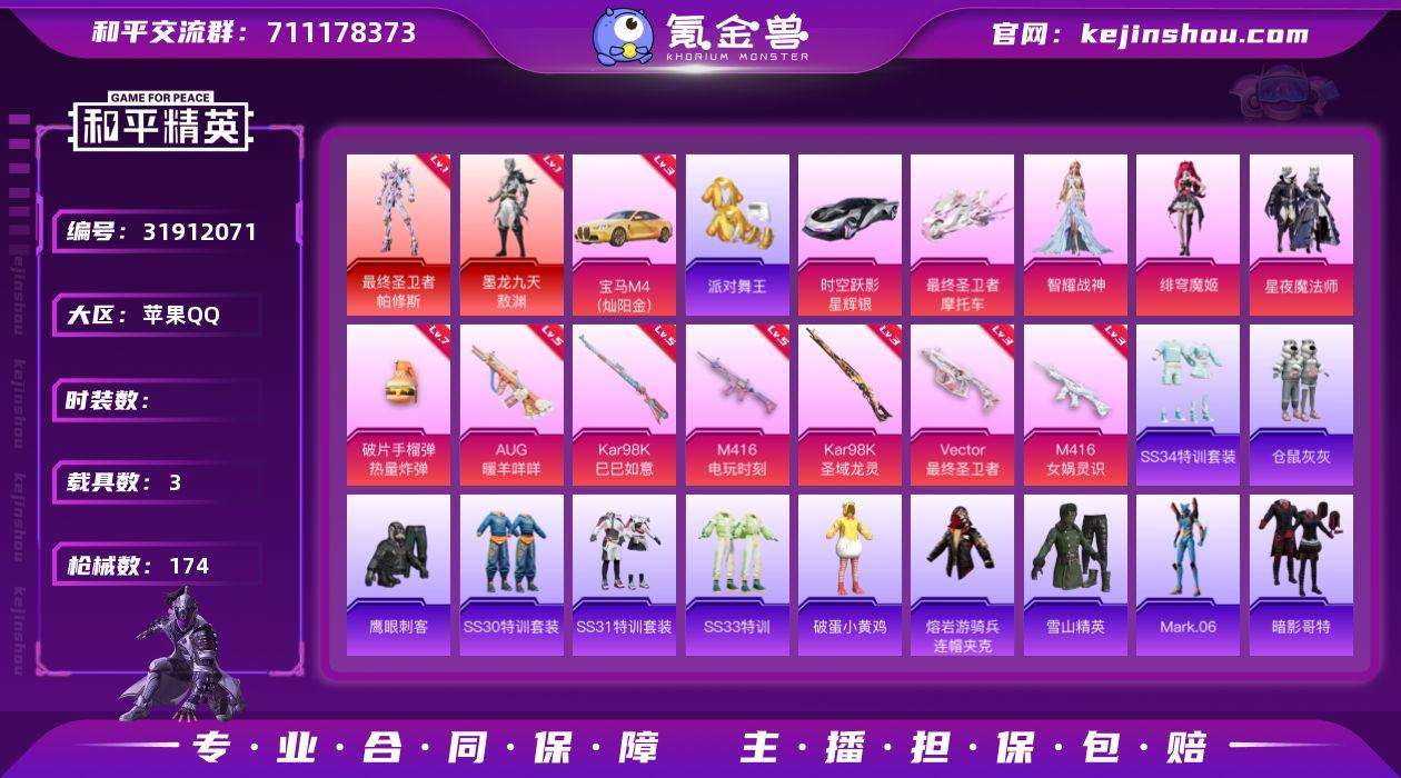苹果Q 不可二次 2红装2稀有3载具4粉装8特效枪9热门120套装174枪皮 61482热力值 8印记 历史传奇王牌12星 【2红装】 最终圣卫者-帕修斯 (1级) 墨龙九天-敖渊 (1级) 【2稀有】 派对舞王 派对舞王(金靴子) 【3载具】 宝马M4(灿阳金) (3级) 时空跃影(星辉银) 最终圣卫者摩托车 【4粉装】 奇迹舞步美雪 绯穹魔姬 智耀战神 星夜魔法师 【8特效枪】 M416-电玩时刻 (5级) M416-女娲灵识 (3级) Kar98K-圣域龙灵 (3级) Kar98K-巳巳如意 (5级) Vector-最终圣卫者 (3级) AUG-暖羊咩咩 (5级) Mk14-福马献瑞 (5级) 破片手榴弹-热量炸弹 (7级) 【9热门】 Mark.06 2B战斗服款 仓鼠灰灰 雪山精英 鹰眼刺客 TT战队服 暗影哥特 漫步者 破蛋小黄鸡 和平精英账号