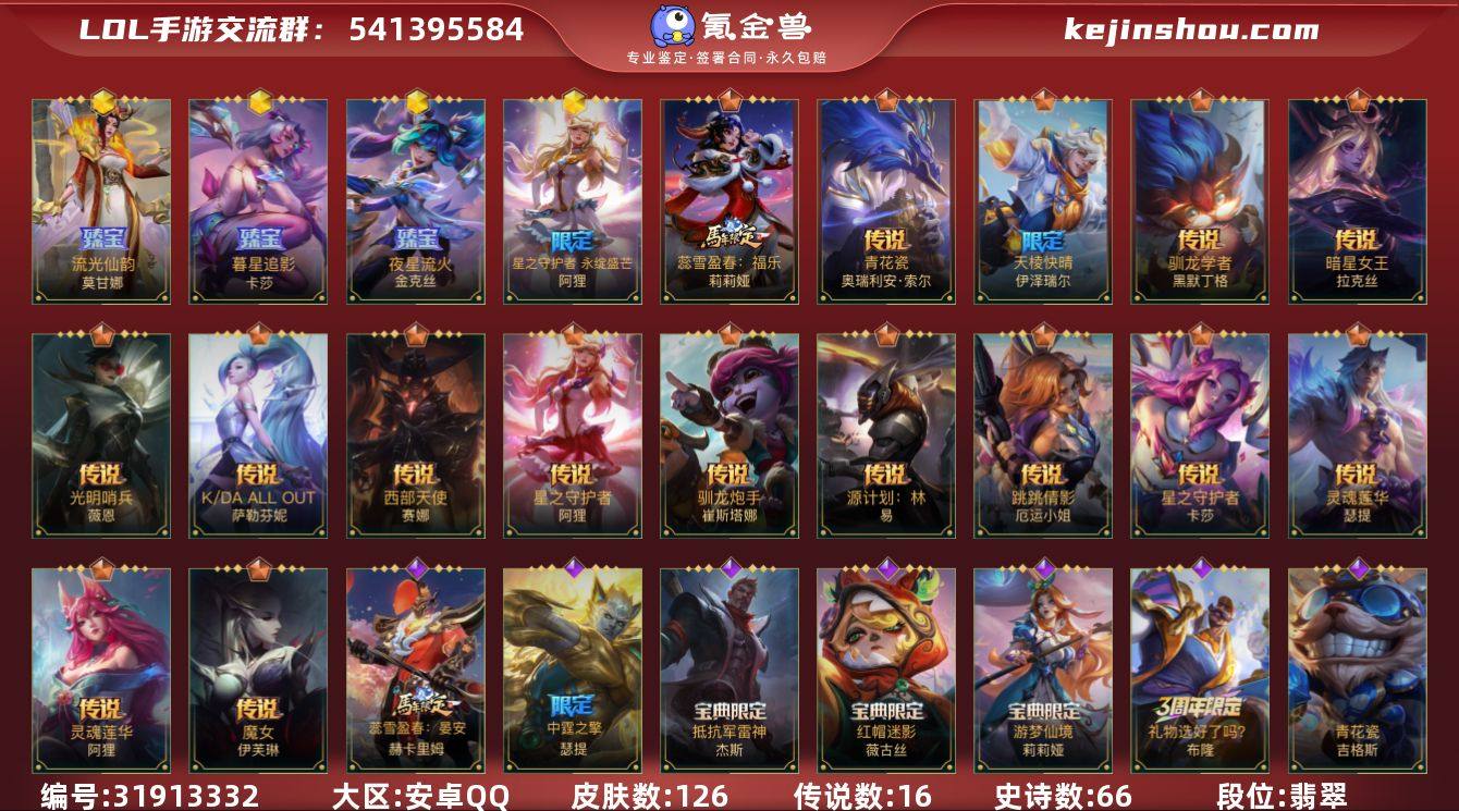 实名: 可修改 段位: 翡翠 皮肤数: 126 神话皮: 星之守护者阿狸永绽盛芒,夜星流火 金克丝,暮星追影 卡莎,流光仙韵 莫甘娜 传说皮: 光明哨兵薇恩,K/DA ALLOUT萨勒芬妮,西部天使赛娜,星之守护者阿狸,驯龙炮手,源计划:林,暗星女王拉克丝,跳跳倩影女枪,星之守护者卡莎,灵魂莲华阿狸,灵魂莲华腕豪,魔女伊芙琳,驯龙学者 黑默丁格,天棱快晴 伊泽瑞尔,青花瓷 奥瑞利安·索尔,蕊雪盈春:福乐 莉莉娅 亮点: 【优质装备】:光明哨兵薇恩,K/DA ALLOUT萨勒芬妮,西部天使赛娜,星之守护者阿狸,驯龙炮手,玉剑传说 武剑仙,源计划:林,暗星女王拉克丝,跳跳倩影女枪,喵喵魅影金克丝,星之守护者阿狸永绽盛芒,星之守护者卡莎,灵魂莲华阿狸,灵魂莲华腕豪,魔女伊芙琳
