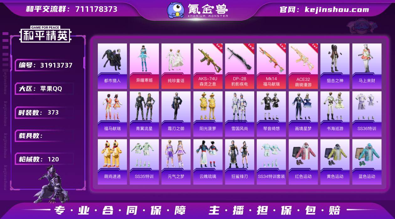 实名: 可修改 时装数: 373 枪械数: 120 热门装扮: 都市猎人,纯珍童话,异瞳寒姬 稀有枪皮: DP-28-豹影疾电,AKS-74U-森灵之息,MK14-福马献瑞,ACE32-萌骑漫游 亮点: 【优质装备】:都市猎人