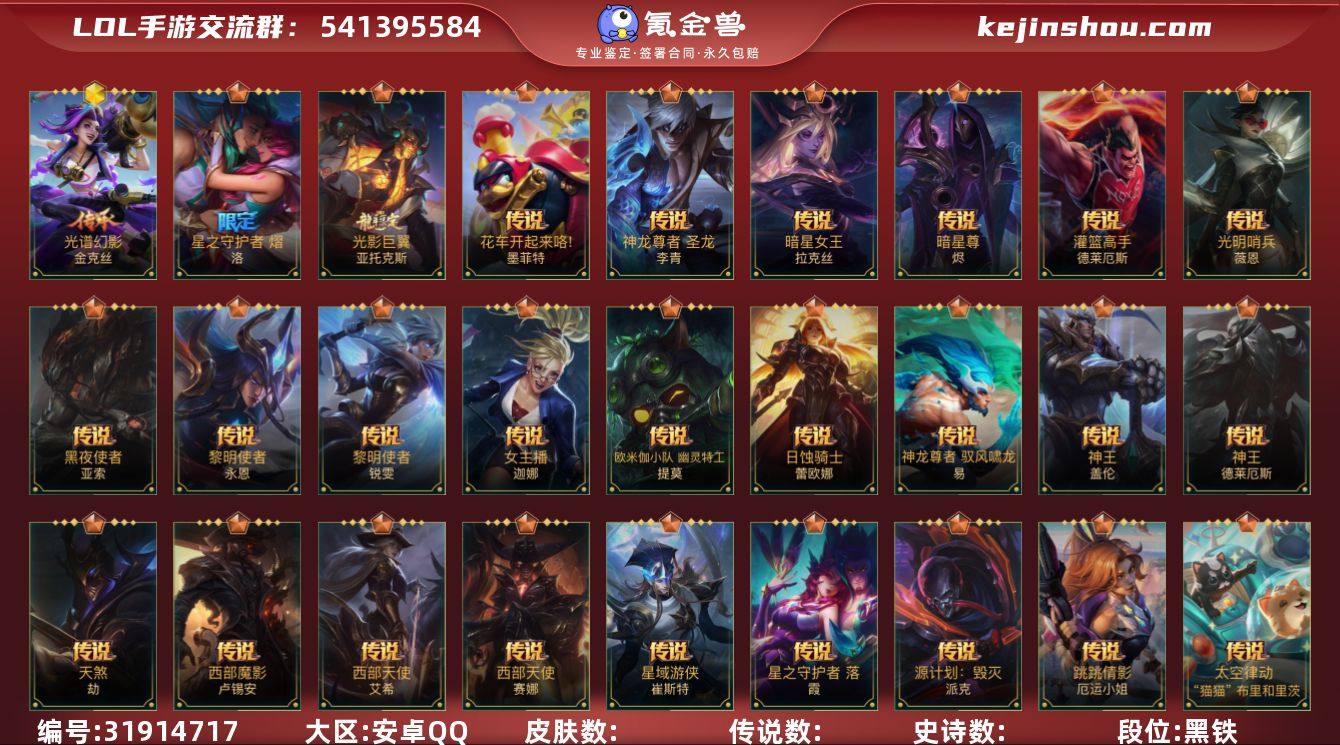 【编号04744】店长推荐特价处理精品号 112英雄-199皮肤 【神话皮肤】:星域游侠 圣时豪杰 崔斯特,星之守护者 永绽盛芒 阿狸,灰烬骑士 派克 【限定皮肤】:水晶玫瑰 嘉文四世,山海绘卷 烬,山海绘卷 沃利贝尔 【传说皮肤】:神王 盖伦,暗星女王 拉克丝,心之钢 凯隐,暗星尊 烬,星域游侠 崔斯特,星之守护者 卡莎,黑夜使者 亚索,斗魂无双 亚索,灵魂莲华 阿狸,天煞 劫,星域武神 贾克斯,西部魔影 卢锡安,月蚀骑士 蕾欧娜,驯龙炮手 崔丝塔娜,神拳 李青,炼狱魔犬 内瑟斯,灵魂莲华 瑟提,黎明使者 永恩,源计划:林 易,神龙尊者 驭风啸龙 易,灌篮高手 德莱厄斯,神王 德莱厄斯,光明哨兵 格雷福斯,西部天使 艾希,战斗学院 伊泽瑞尔,源计划:泯灭 雷克顿,灵魂莲华 锤石 【史诗皮肤】:霸天剑魔 亚托克斯,惊悚派对 阿木木,殇之机器人 阿木木,摄魂猎手 凯隐,霸天战士 雷恩加尔,黎明使者 卡尔玛,探梦奇旅 艾克,无限烈焰 黛安娜,猎龙勇士 赵信,霸天异形 卡兹克,暗星 卡兹克,西部魔影 赫卡里姆,烘焙童谣 悠米,圣诞老人 布隆,西部牛仔 烬,腥红之月 烬,灭迹行者 烬,山海绘卷 烬,霸天龙神 奥瑞利安·索尔,弹幕天使 卡莎,斗魂无双 尼菈,猎龙勇士 潘森,未来战士 潘森,铁血女忍 阿卡丽,K/DA ALL OUT 阿卡丽,战场之王 布里茨,福牛守护者 安妮,源计划:风 亚索,战场之王 亚索,灵魂莲华 亚索,幻梦甜心 阿狸,源计划:阴 劫,灵能特工 劫,武神 贾克斯,屠龙勇士 凯尔,源计划:雷 卢锡安,娜就去看看 崔丝塔娜,灵魂莲华 崔丝塔娜,大魔王 提莫,灵魂莲华 提莫,小蜜蜂 提莫,电玩女神 娑娜,银河魔装机神 希瓦娜,源计划:裁决 蔚,魔女 卡蜜尔,星域审判官 卡蜜尔,暗星 嘉文四世,水晶玫瑰 嘉文四世,福牛守护者 嘉文四世,山海绘卷 沃利贝尔,地下拳王 李青,柯基 库奇,龙腾虎...