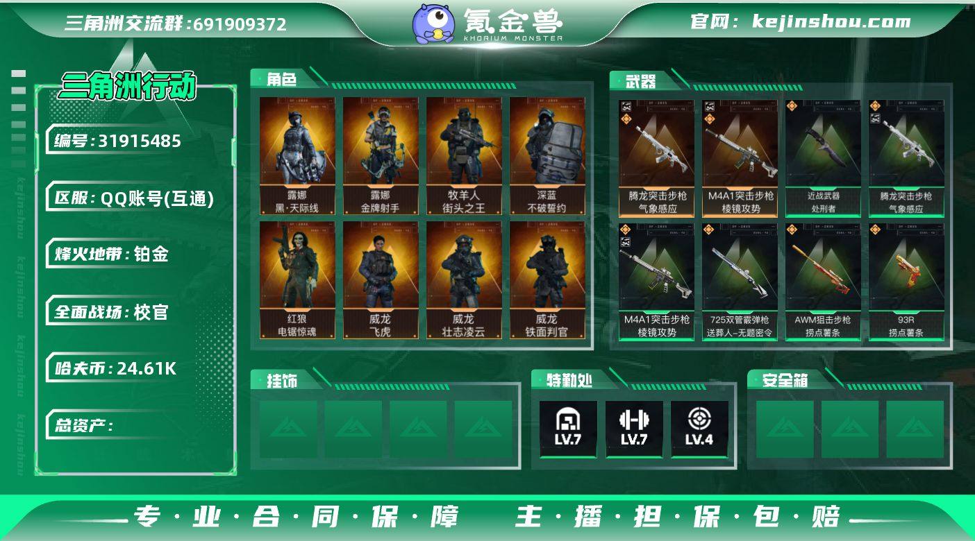【优品C棱镜攻势 气象感应 红皮露娜 铁面判官 威龙吴彦祖 S8赛季高级安全箱 14颗AW子弹 处刑者】总资产206M,哈夫币24,613K,行动等级:60,传说典藏数量:2,近战数量:1,干员红皮数量:1,仓库等级:7级,训练中心等级:7级,靶场等级:4级,干员皮肤:10,枪皮:447 【传说典藏】 M4A1突击步枪-棱镜攻势 腾龙突击步枪-气象感应 【近战武器】 近战-处刑者 黑鹰 【干员皮肤】 露娜-黑·天际线 威龙-铁面判官 威龙-飞虎 红狼-电锯惊魂 露娜-金牌射手 牧羊人-街头之王 威龙-壮志凌云 蜂医-送葬人·无题密令 无名-夜鹰 深蓝-不破誓约 【传说挂饰】 黄金坦克 爆裂鼓声 黑 狻猊 【载具】 防空车-赤色军团 步战车-几何碎片 步战车-生命线 防空车-生命线 全地形车-童趣 轮式突击炮-护林人 M1A4坦克-哈夫克重工 侦察直升机-火焰 M1A4坦克-纷争 M1A4坦克-飓风行动 步战车-纷争 突击车-纷争 防空车-纷争 突击直升机-纷争 M1A4坦克-森林迷彩 M1A4坦克-夜间迷彩 M1A4坦克-冷钢 M1A4坦克-战痕 M1A4坦克-地平线 M1A4坦克-黄蜂 M1A4坦克-狮王 M1A4坦克-鹰击长空 M1A4坦克-无瑕 M1A4坦克-黑骑士 步战车-雪地迷彩 步战车-森林迷彩 步战车-夜间迷彩 步战车-炭黑蜂窝 步战车-战痕 步战车-黄蜂 步战车-猎虎 步战车-酒红 步战车-鹰击长空 步战车-黑骑士 步战车-卦象 突击车-雪地迷彩 突击车-森林迷彩 突击车-沙漠迷彩 突击车-冷钢 突击车-鹰击长空 防空车-森林迷彩 防空车-夜间迷彩 防空车-沙漠迷彩 防空车-炭黑蜂窝 防空车-黄蜂 防空车-猎虎 防空车-酒红 防空车-鹰击长空 防空车-黑骑士 防空车-卦象 突击直升机-冷钢 突击直升机-地平线 突击直升机-黄蜂 突击直升机-猎虎 突击直升机-狮王 突击直升机-鹰击长空 突击直升机-无瑕 突击直升机-黑骑士 侦察直升机-夜间迷彩 侦察直升机-沙漠迷彩 侦察直升机-卦象 全地形车-森林迷彩 全地形车-沙漠迷彩...