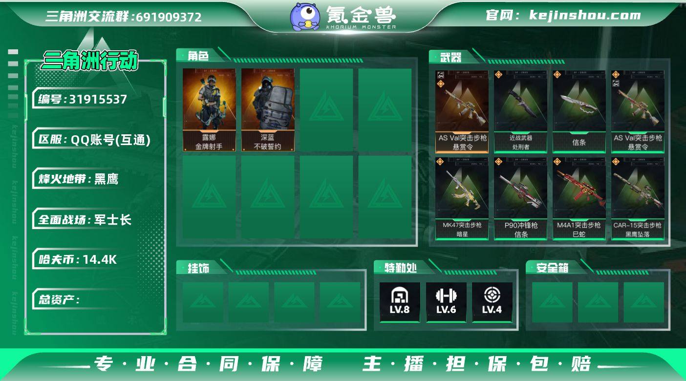 可二次【优品B悬赏令 信条 S8赛季高级安全箱 50颗AW子弹 处刑者】总资产152M,哈夫币14,405K,行动等级:60,传说典藏数量:1,近战数量:2,仓库等级:8级,训练中心等级:6级,靶场等级:4级,干员皮肤:2,枪皮:178 【传说典藏】 AS Val突击步枪-悬赏令 【近战武器】 近战-信条 近战-处刑者 黑鹰 【干员皮肤】 露娜-金牌射手 深蓝-不破誓约 【传说挂饰】 凌霄戍卫 信条 暗星 【载具】 轮式突击炮-护林人 【其他典藏】 腾龙突击步枪-古铜 SG552突击步枪-巨兽 PTR-32突击步枪-碎冰行动 【枪皮】 K437突击步枪-私人订制 AWM狙击步枪-私人订制 M4A1突击步枪-高雅黑 QBZ95-1突击步枪-高雅黑 G3战斗步枪-高雅黑 QBZ95-1突击步枪-曙光 M4A1突击步枪-海色 QBZ95-1突击步枪-海色 SCAR-H战斗步枪-荣耀列队 PTR-32突击步枪-黄蜂 K437突击步枪-私人定制 QBZ191突击步枪-三角洲力量 SG552突击步枪-海浪 QBZ95-1突击步枪-海浪 M4A1突击步枪-黑金玫瑰 K416突击步枪-碳纤维 SCAR-H战斗步枪-数码迷彩 M4A1突击步枪-粉色涂装 M7战斗步枪-红色涂装 AUG突击步枪-浅蓝涂装 SG552突击步枪-浅蓝涂装 K416突击步枪-几何迷彩 K416突击步枪-高雅黑 AWM狙击步枪-私人定制 SV-98狙击步枪-红色涂装 SKS射手步枪-弄臣 Mini-14射手步枪-荣耀列队 SR-25射手步枪-黄蜂 SMG-45-行动开启 MP5冲锋枪-海色 MP5冲锋枪-安全工作 P90冲锋枪-安全工作 MP5冲锋枪-黄蜂 Vector冲锋枪-阿萨拉文明 QCQ171冲锋枪-三角洲力量 Vector冲锋枪-先锋 Vector冲锋枪-几何迷彩 M1014霰弹枪-海浪 M1014霰弹枪-高雅黑 M1014霰弹枪-幻影结构 QJB201轻机枪-三角洲力量 M249轻机枪-黄蜂 G18-星链科技 沙漠之鹰-海浪