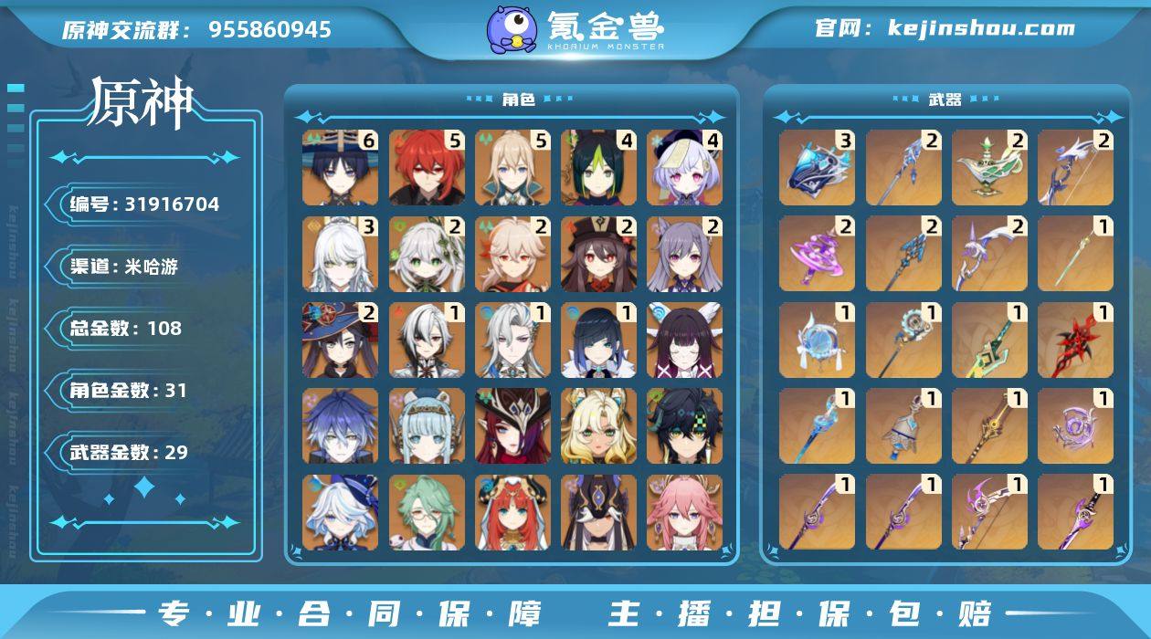 龙王(350w) 流浪者(多段不清楚) 菲林斯(一套450w) n5+深渊随便过 角色池大保底 4/5五星角色都有专武 有本期(128的)大月卡 小月卡 3命滋白加专武